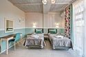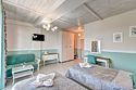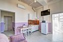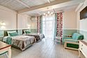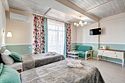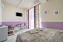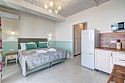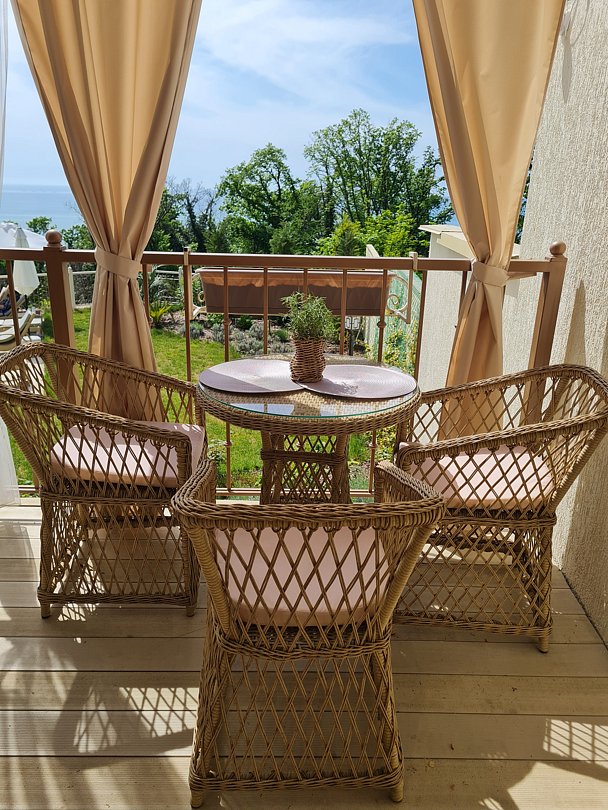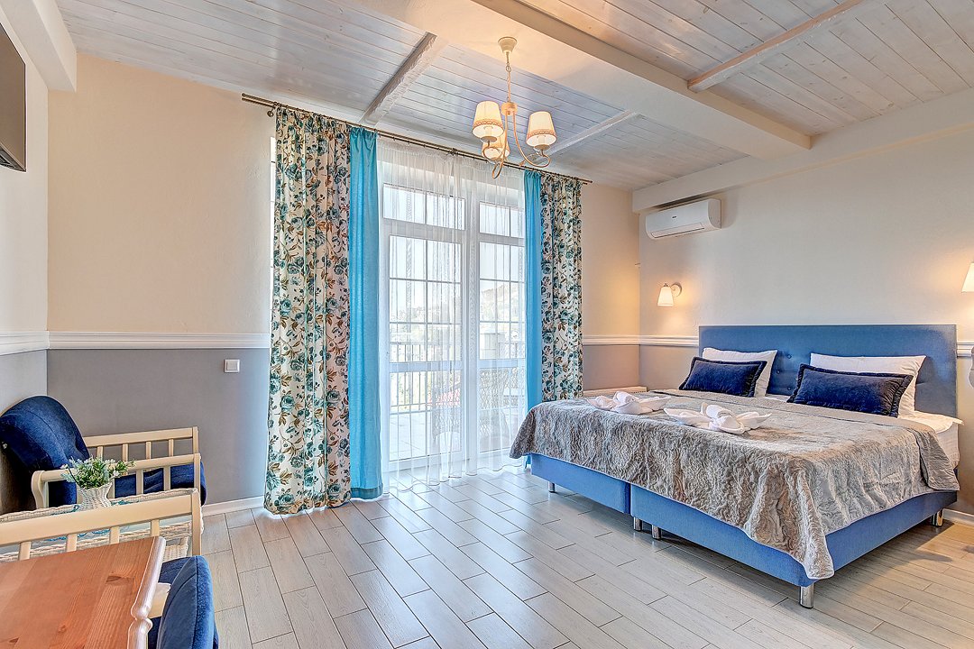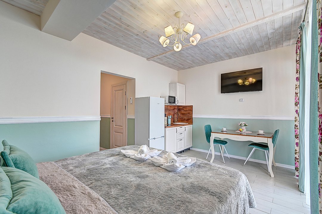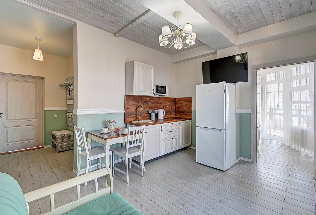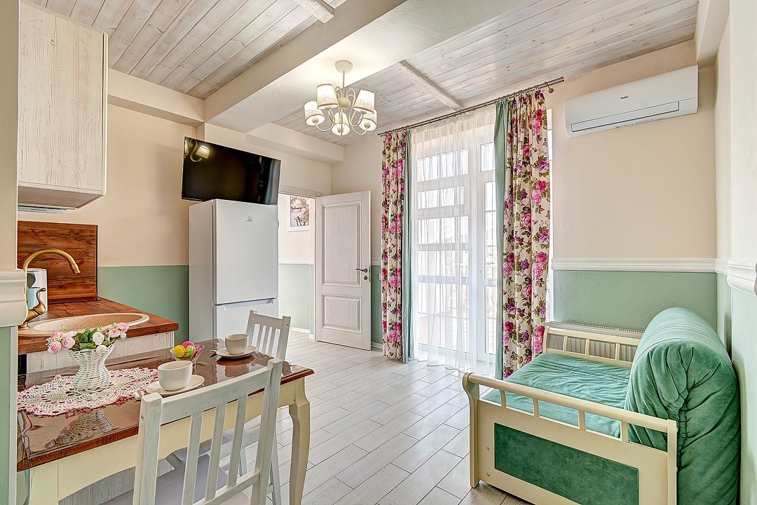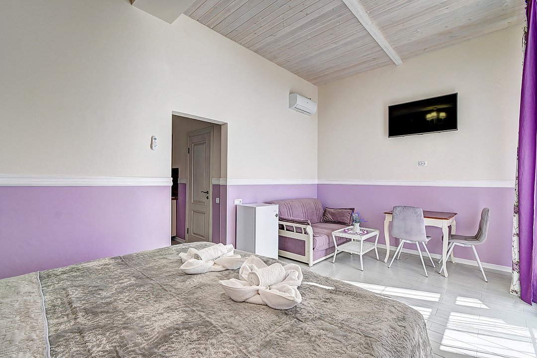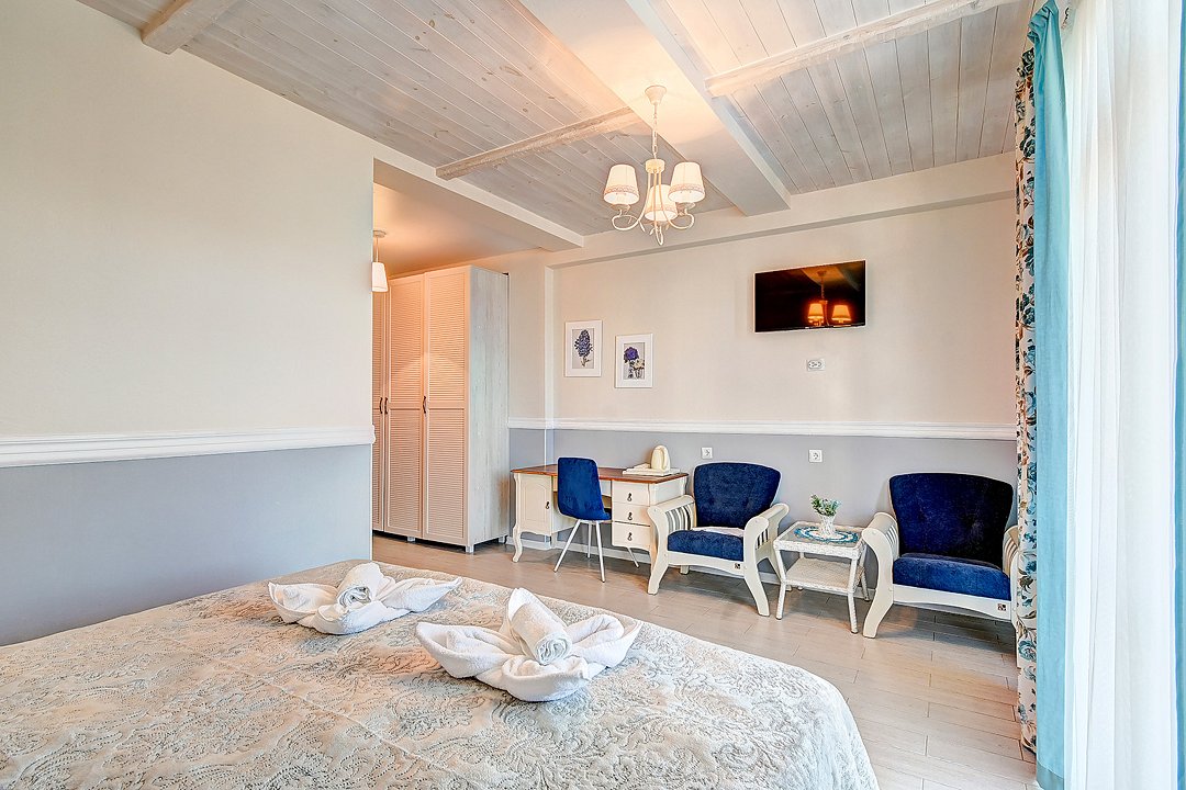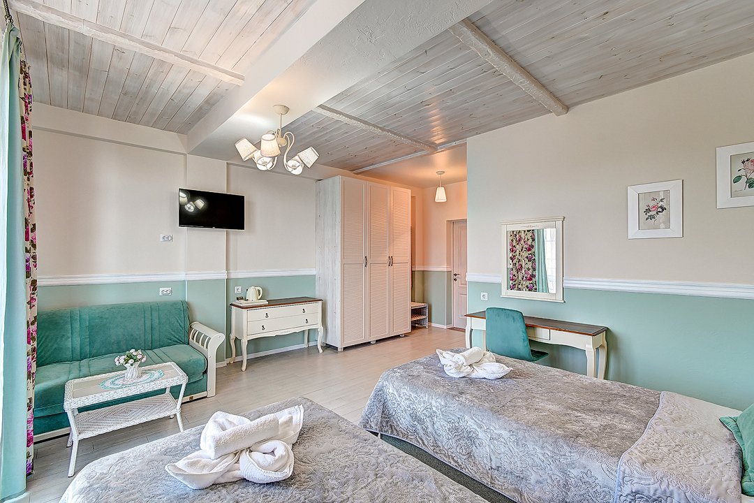 Уютные просторные номера, оформленные в стиле Прованс, со всеми необходимыми принадлежностями для комфортного отдыха. В каждой комнате имеется кровать, раскладной диван или кресла, журнальный столик, туалетный столик, комод или письменный стол, шкаф, телевизор, холодильник, кондиционер, электрочайник и чайные наборы; в ванной комнате: душ, туалет, фен, гигиенический принадлежности. Из каждой комнаты есть выход на собственную террасу с видом на море, горы или город, оборудованную плетеной мебелью, где можно насладиться прекрасными видами заходящего солнца. Панорамные окна наполняют светом комнату и делают море частью интерьера. В апартаментах и студиях есть кухонная зона со всем необходимым для приготовления еды. Для остальных номеров предусмотрены 3 общих оборудованных кухни на каждом этаже.