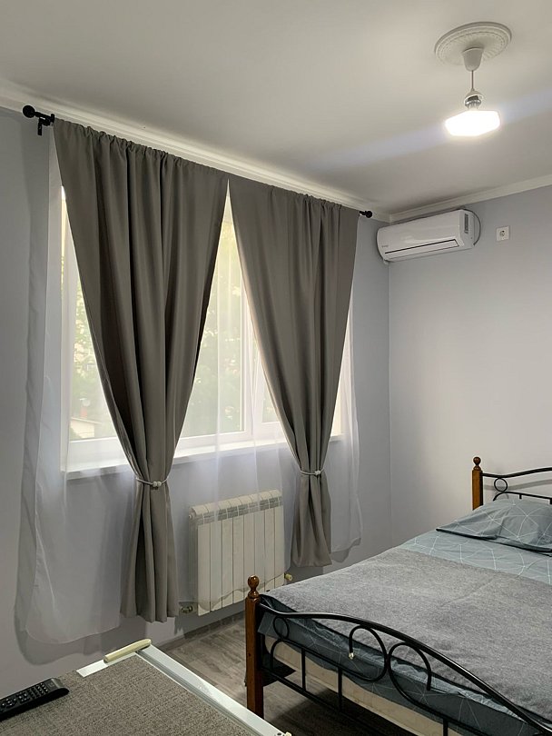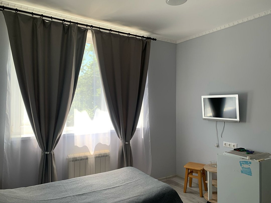 В комнате: кабельное ТВ, холодильник, двухспальная кровать, шкаф, туалетный столик, кофейный столик, стулья, зеркало, предусмотрено место для сушки белья. Совмещений санузел, в комнате. Комплект белья и полотенец. В холе для общего пользования предусмотрена гладильная доска с утюгом, электрический чайник.