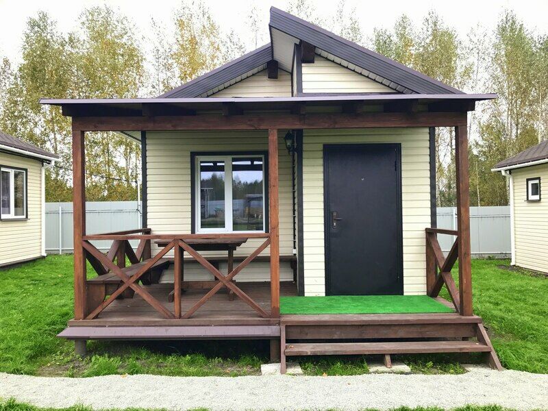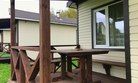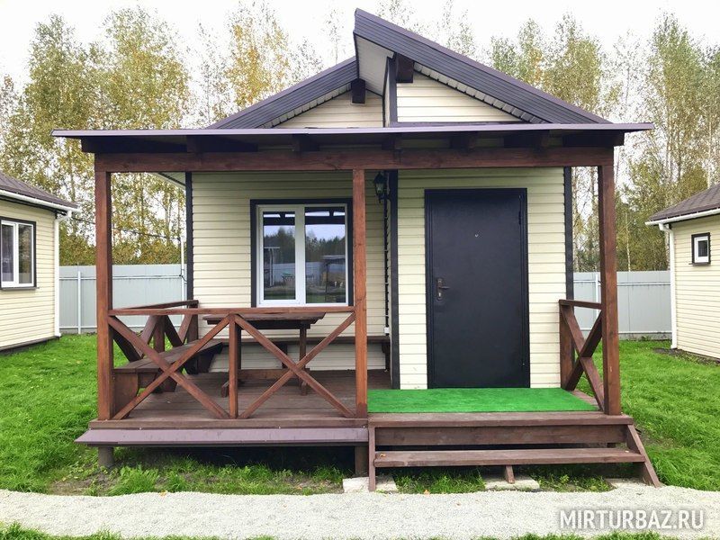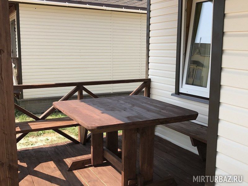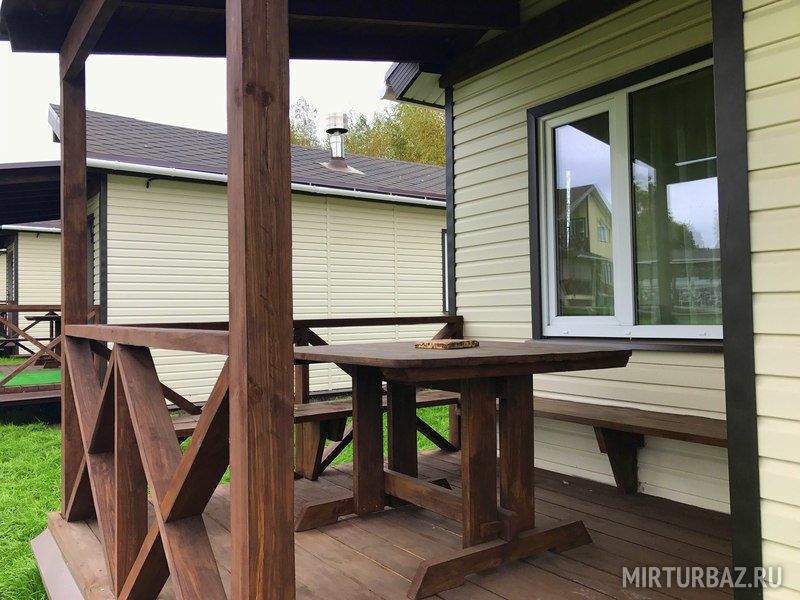 У каждого домика имеется собственная терраса на 8 человек со столом, лавками, освещением, розеткой.
