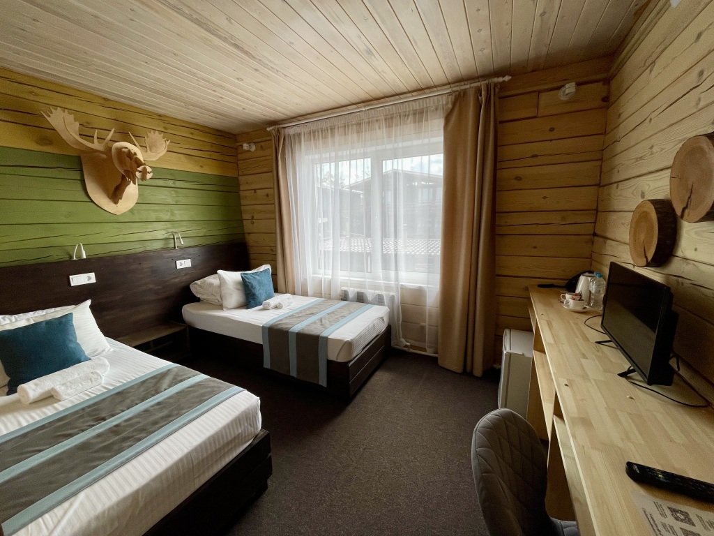 Wi-Fi, настольные лампы, фен, ванная комната, душевая кабина, водонагреватель, банные полотенца, тапочки, кровать «King size», две односпальные кровати, стулья, гардеробная, вешалки, зеркало, комод, чайный набор, обслуживание номеров, сейф, чайник, питьевая вода, ковровое покрытие, отопление, стаканы, туалетные средства, туалет, цифровое тв, мини-холодильник, гостиничная парфюмерия, вид на лесВ гостиничном номере