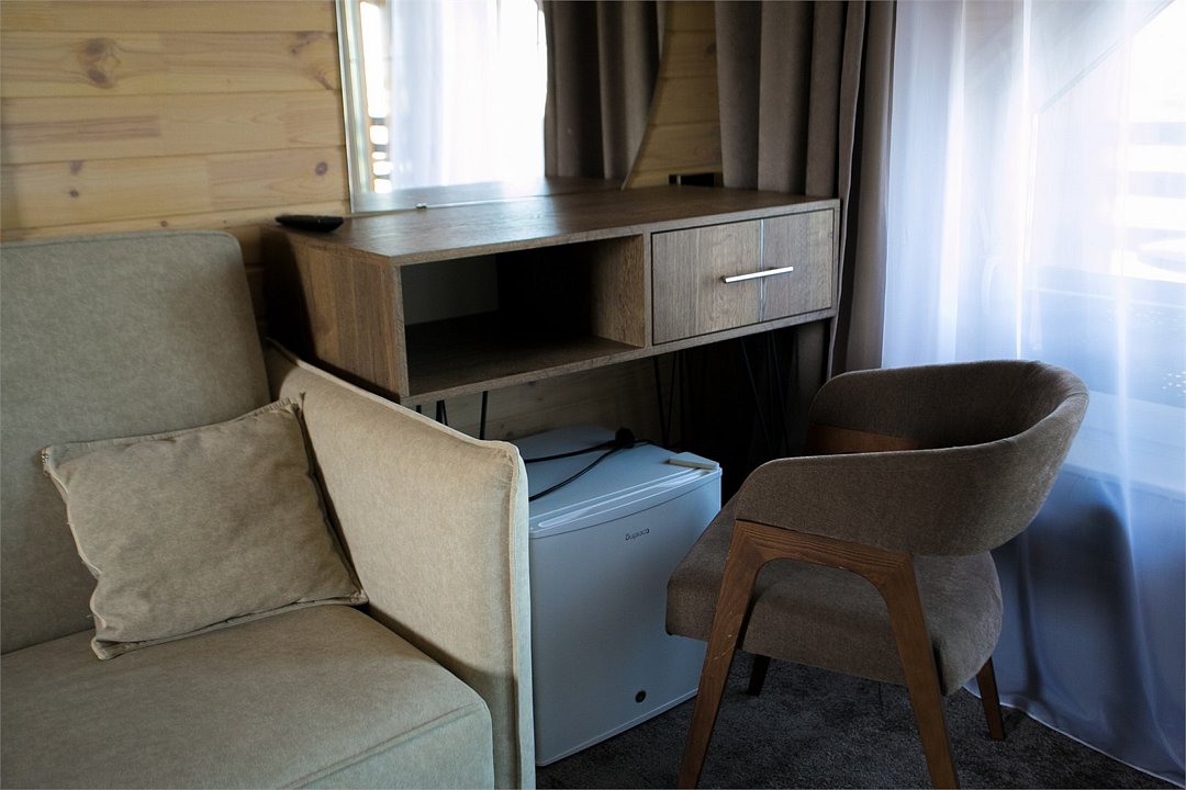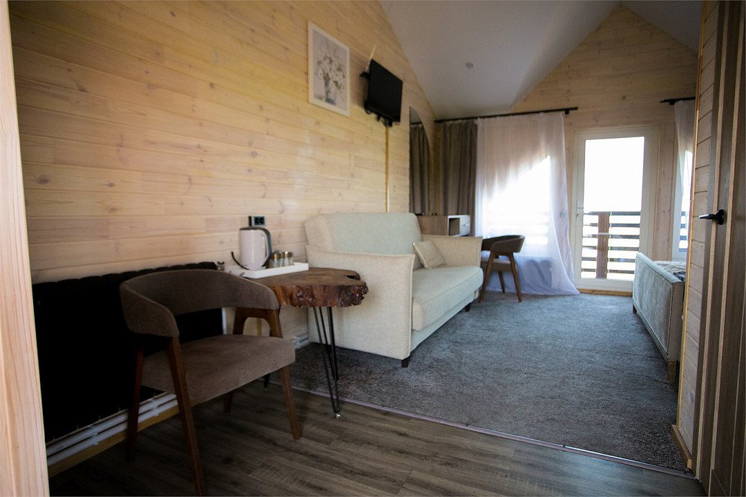 Wi-Fi, обогреватель, терраса, двуспальная кровать, две односпальные кровати, стулья, вешалки, зеркало, звуконепроницаемые стены и окна, чайник, отопление, вид на море, вид во двор, ламинат, стул, стол, тумба, панорамные окна, телевизор с плоским экраном, балкон с боковым видом на море, вешалки-плечики, затемняющая штора, окна от пола до потолка, можно с питомцамиВ домике