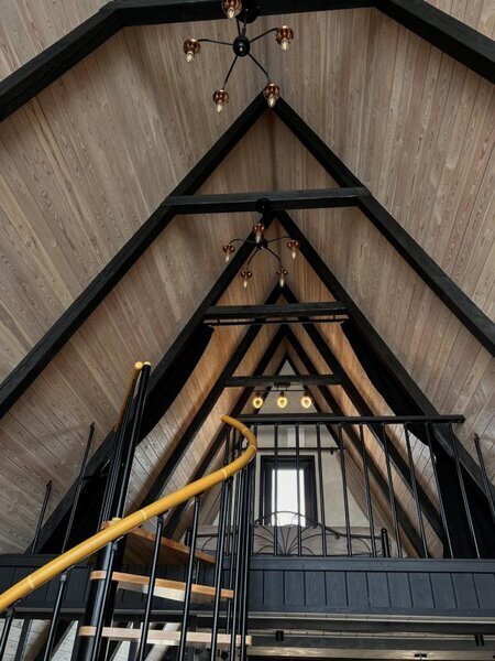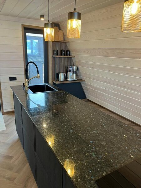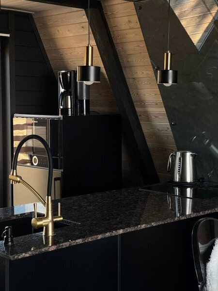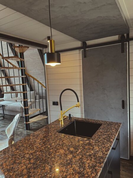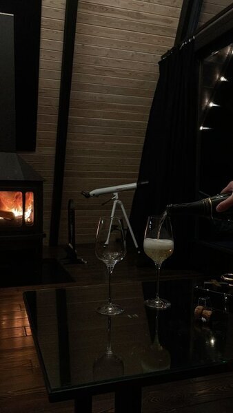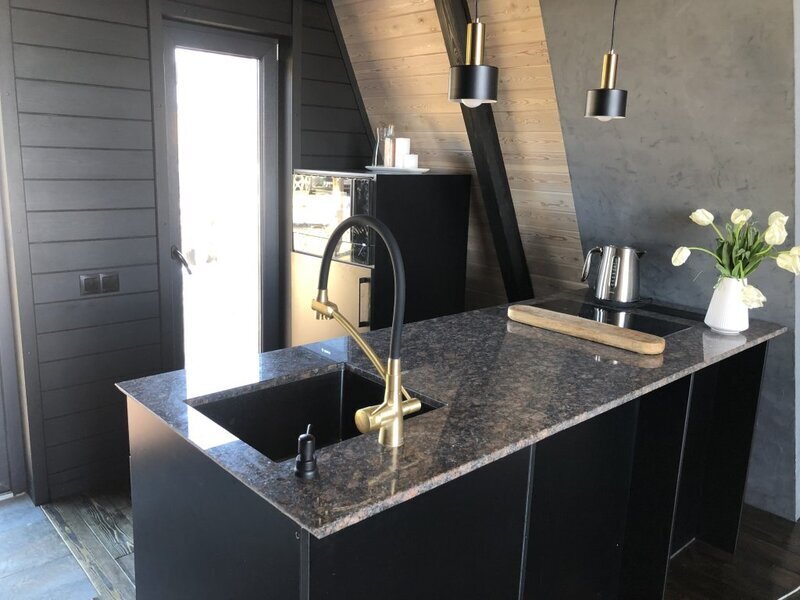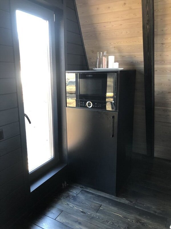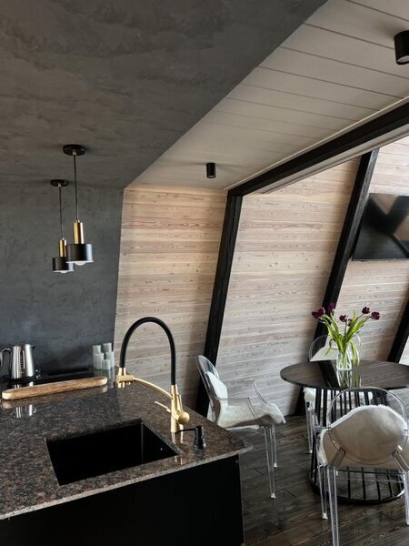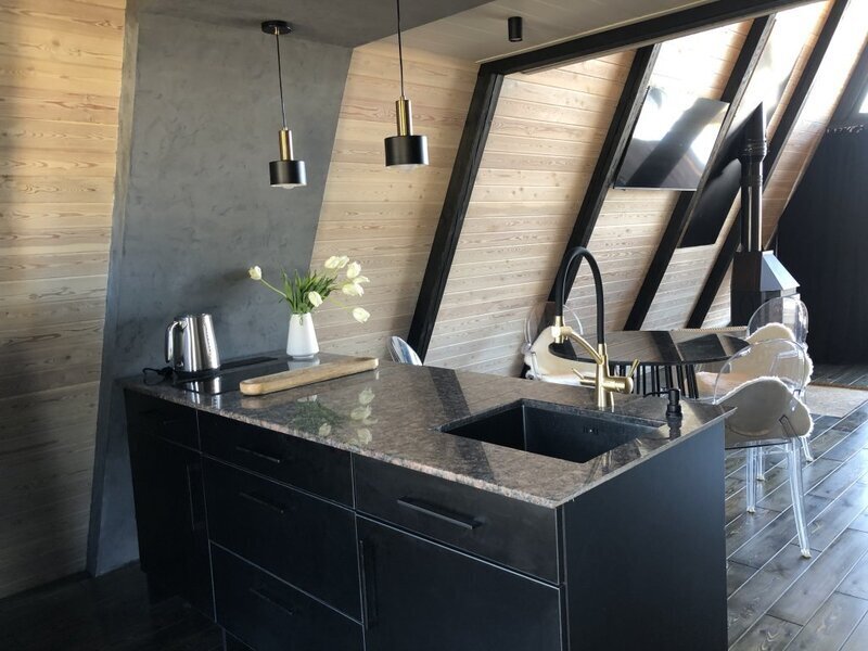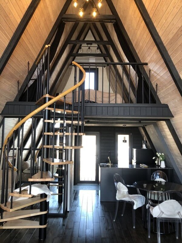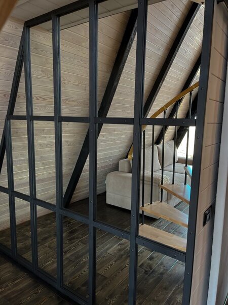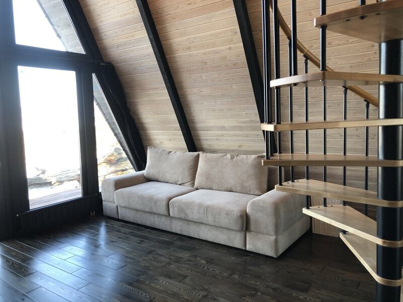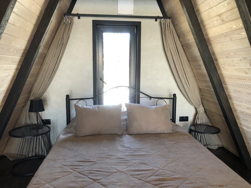 Уютный двухместный коттедж формата А-фрейм со всеми удобствами и красивым видом из окна.