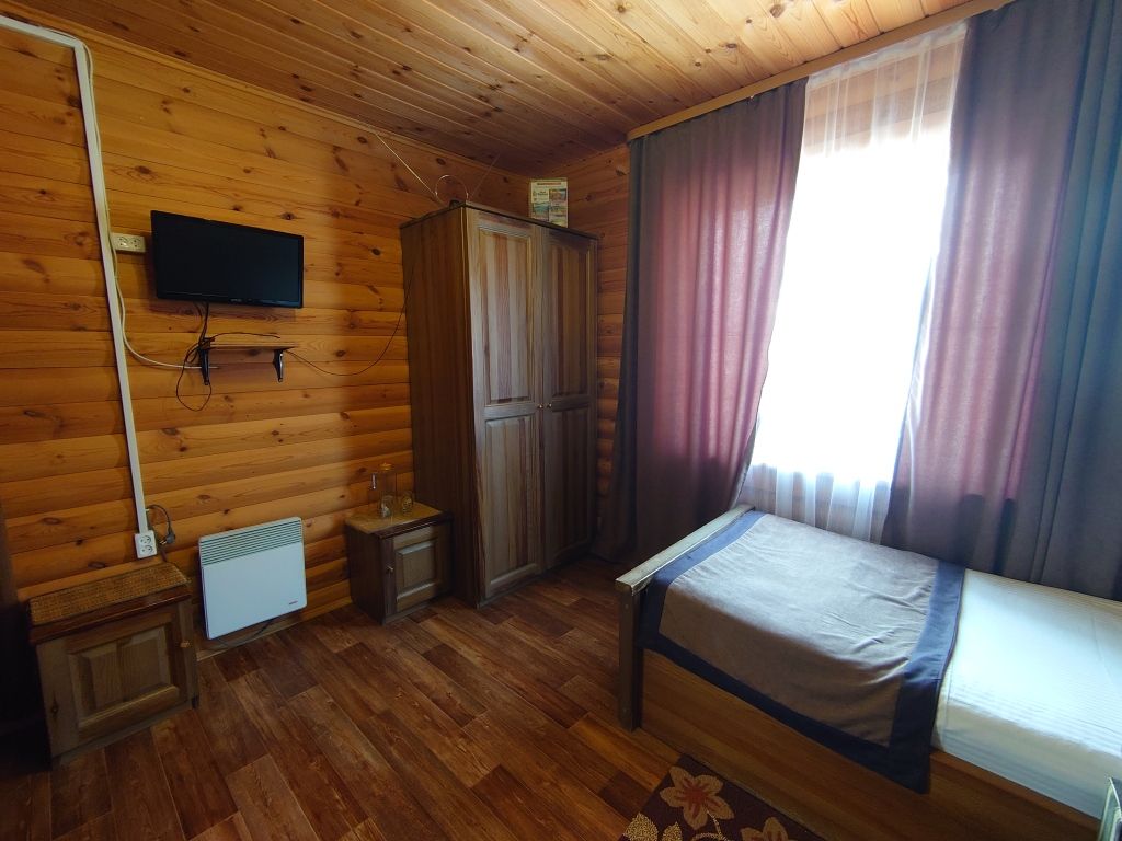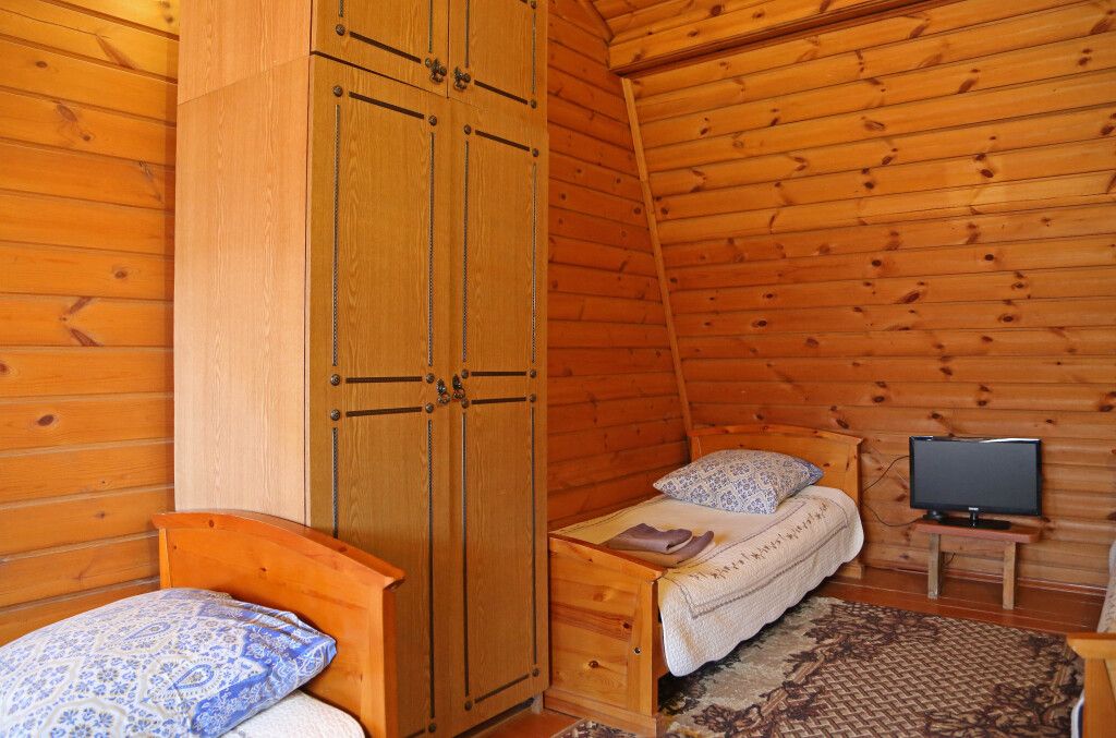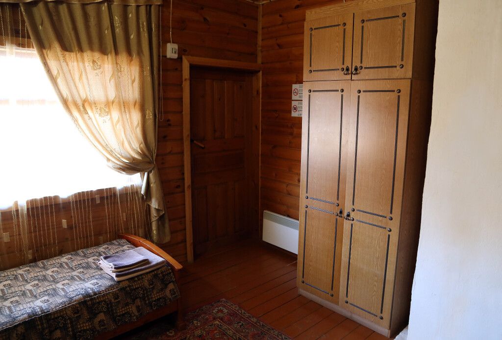 Полноценный санузел в соседнем здании (примерно 15 метров), пять одноместных кроватей, обогреватель, зеркало