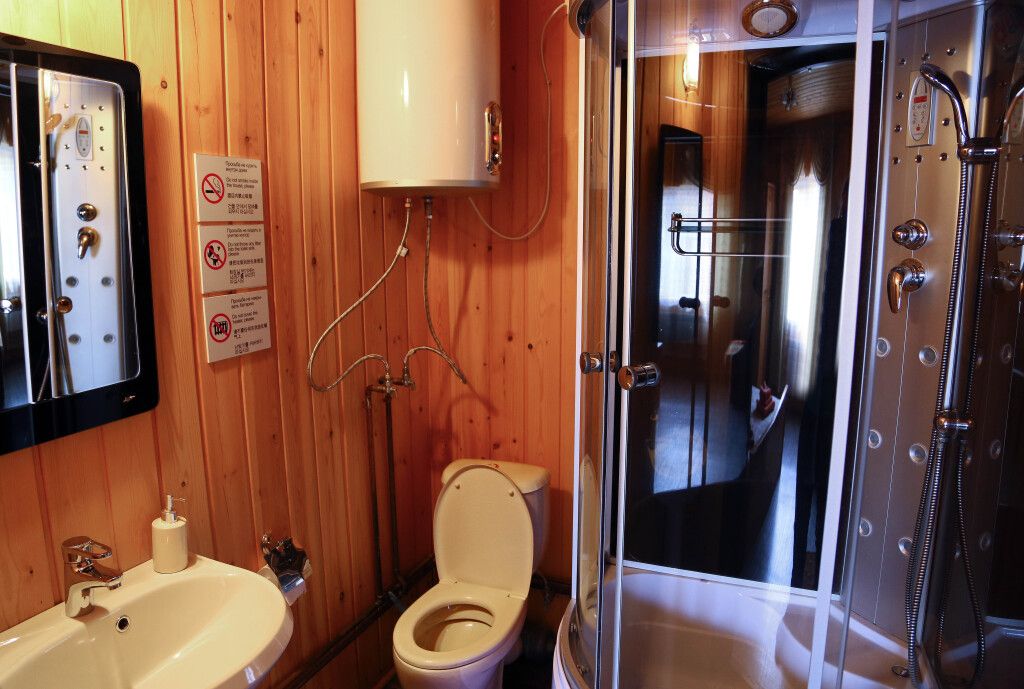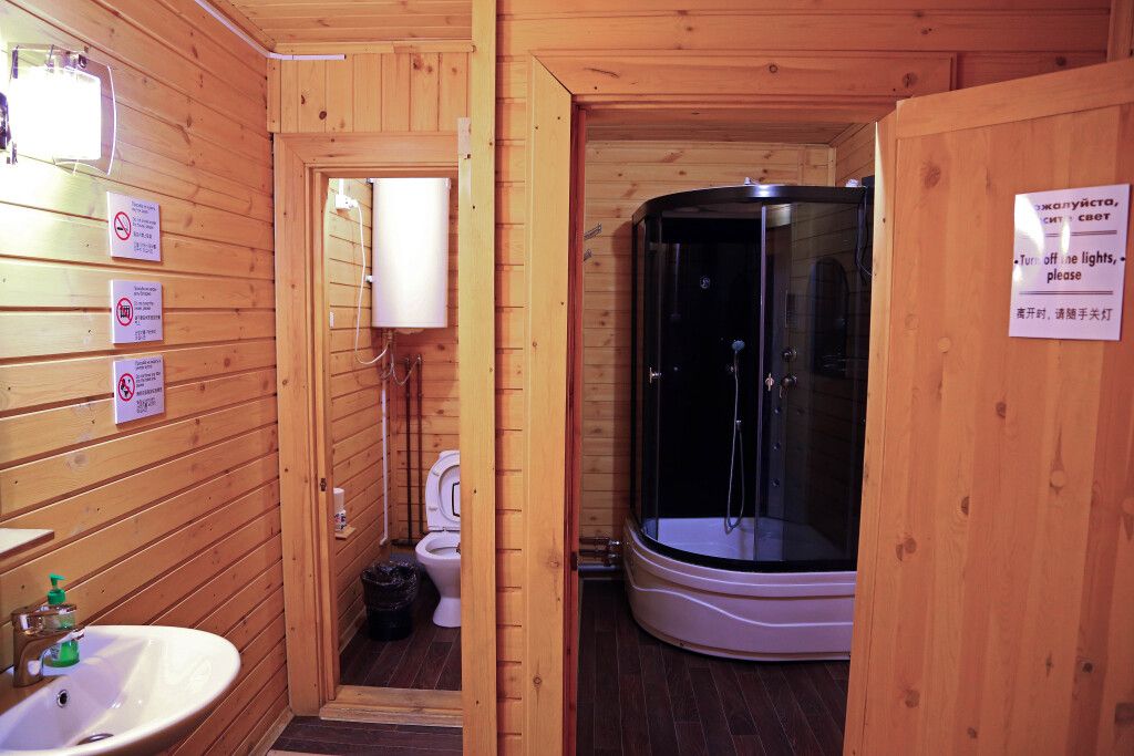 Полноценный санузел в соседнем здании, обогреватель, зеркало, четыре одноместных кровати