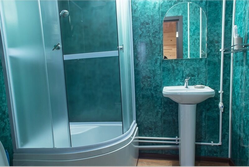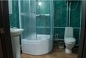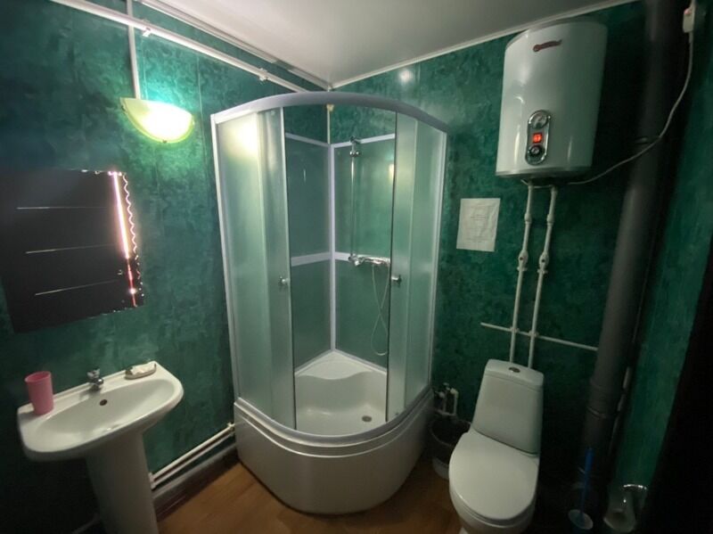 современная евродушевая кабина, раковина, унитаз, индивидуальный водонагреватель.
