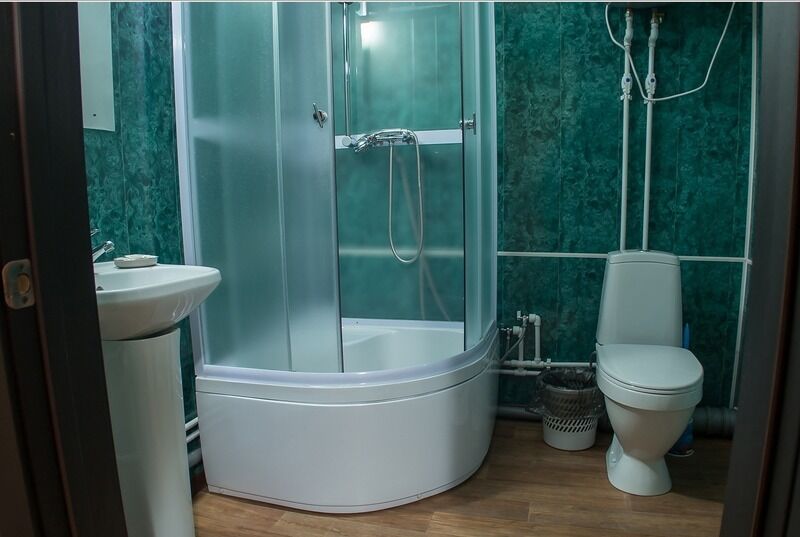 современная душевая кабина, раковина, унитаз, индивидуальный водонагреватель