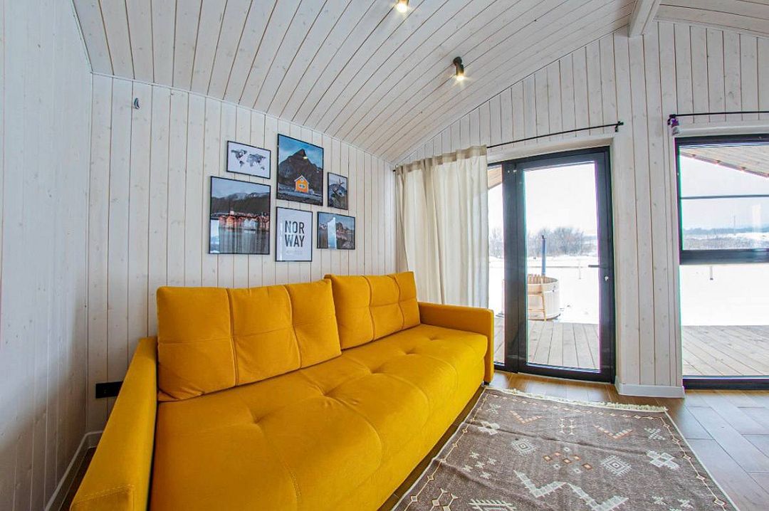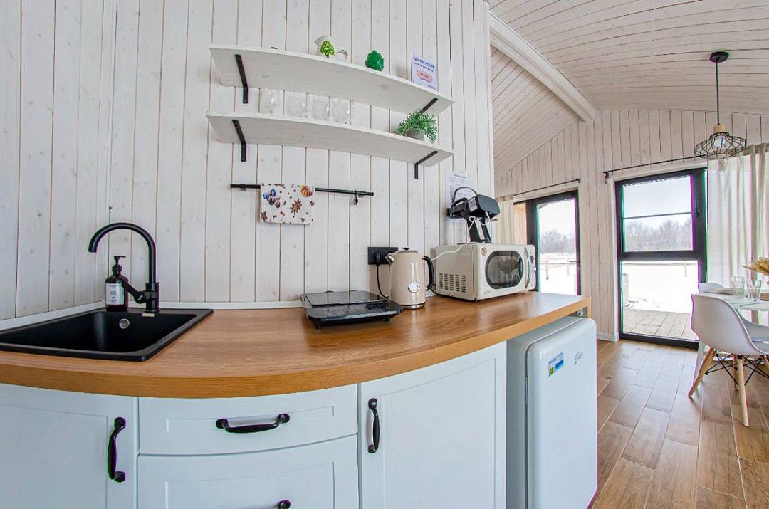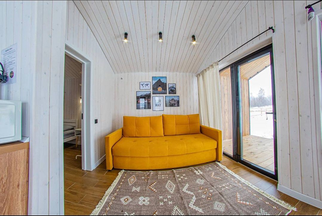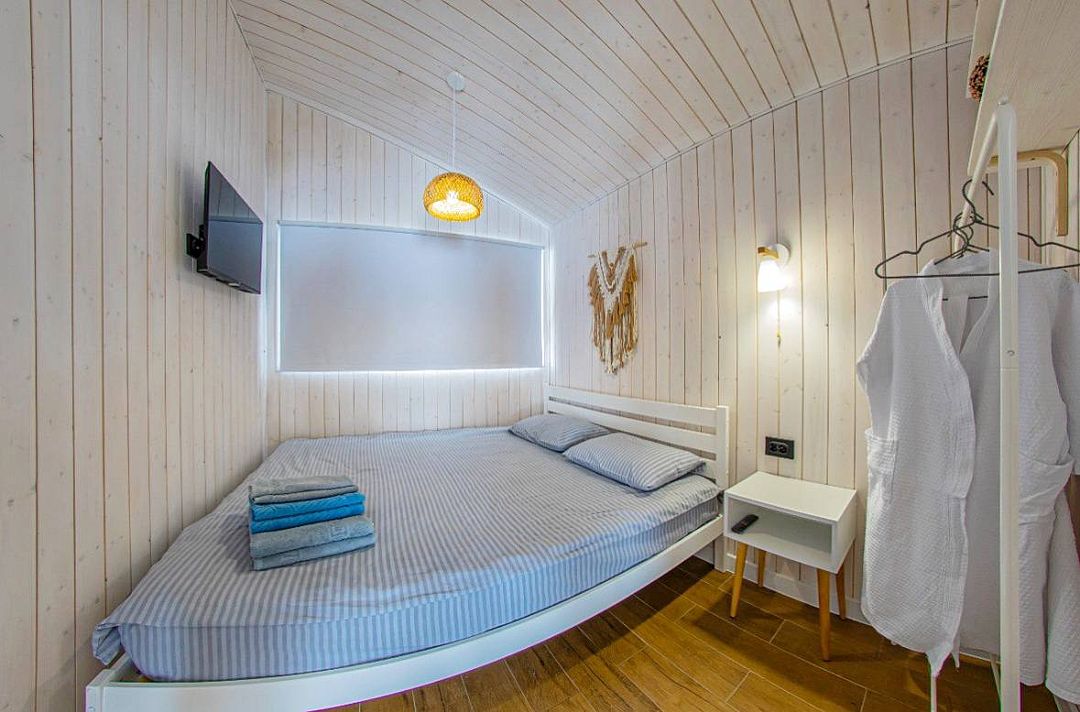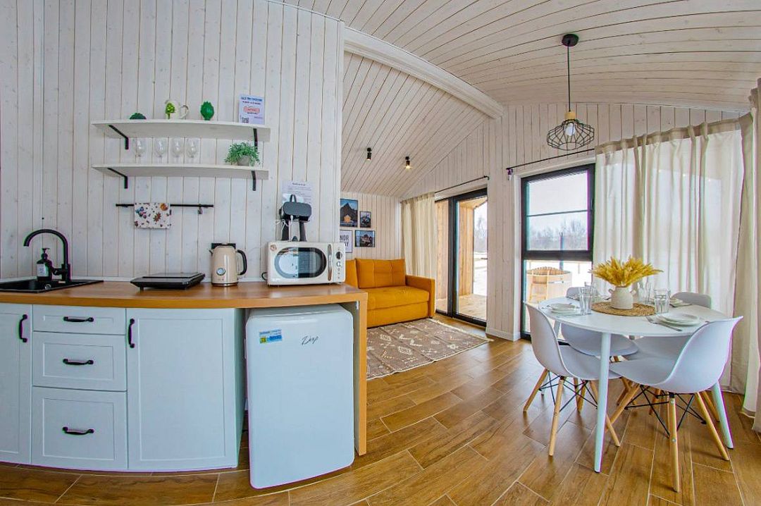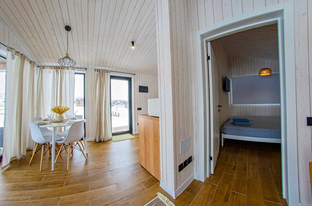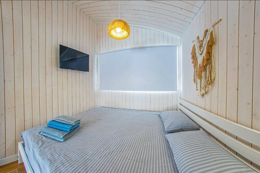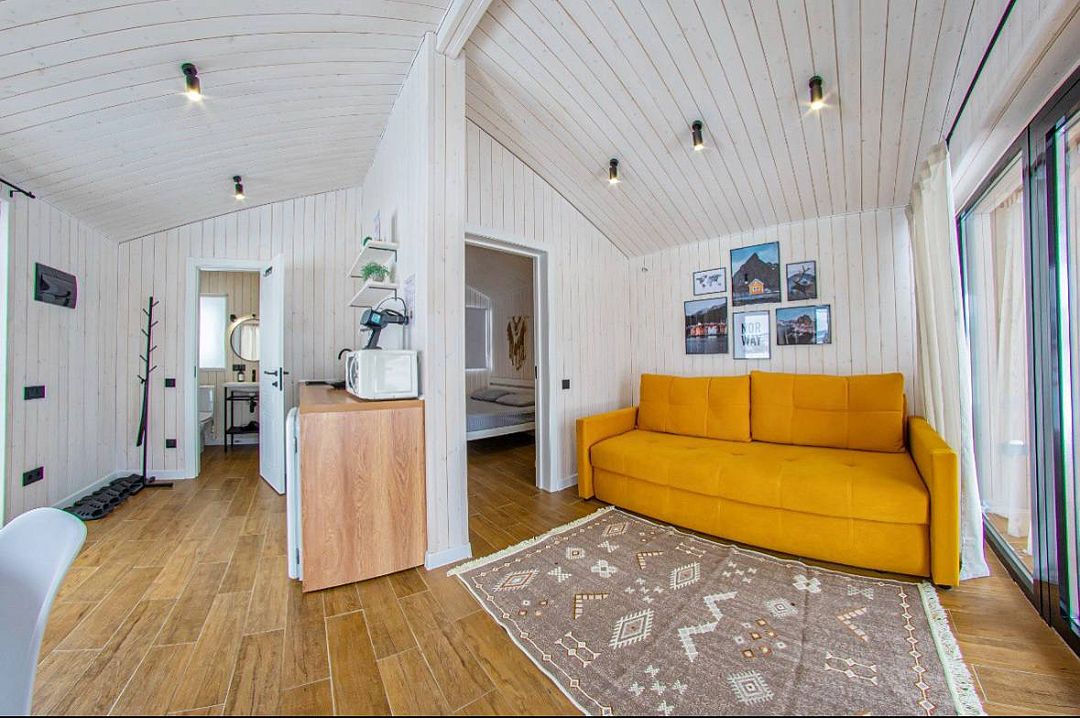 В доме одна изолированная спальня, гостиная, обеденная зона, кухня, также санузел с душем. Имеется вся необходимая техника и посуда для вашего комфортного отдыха.
