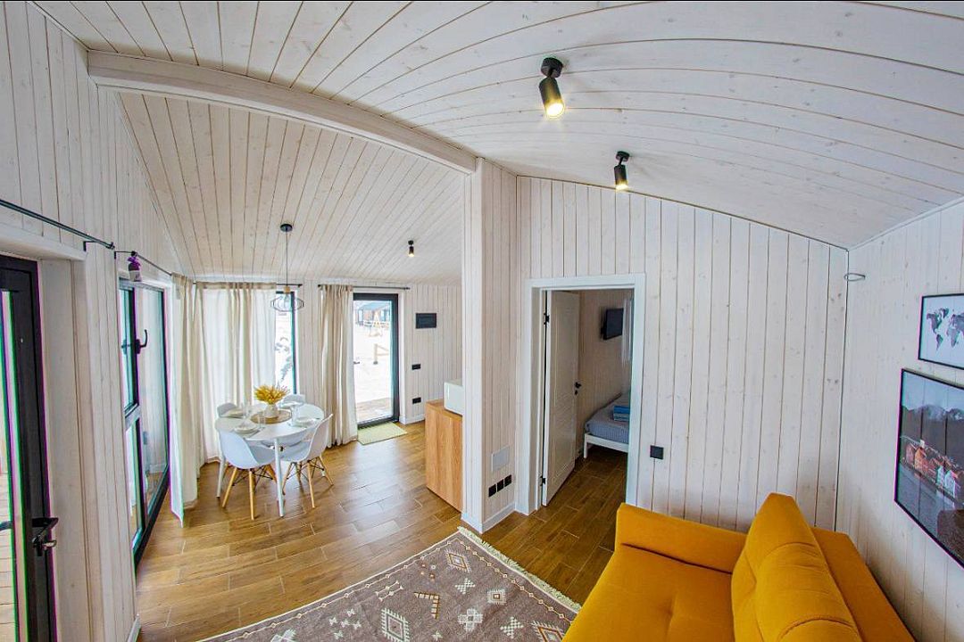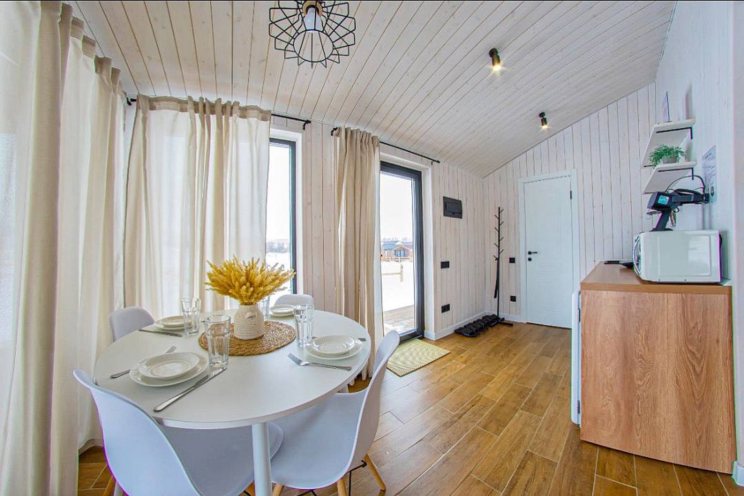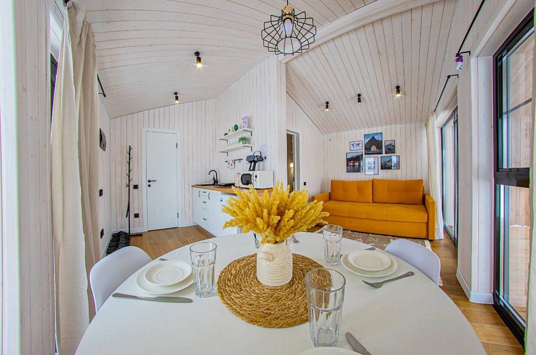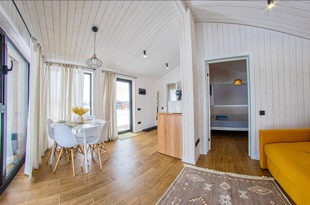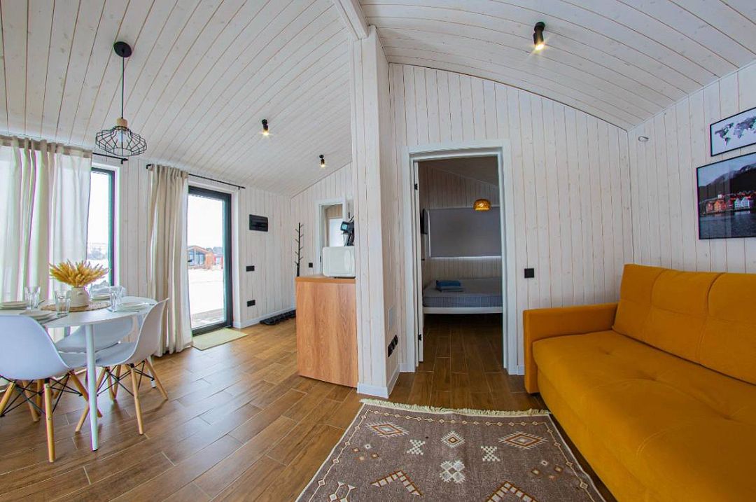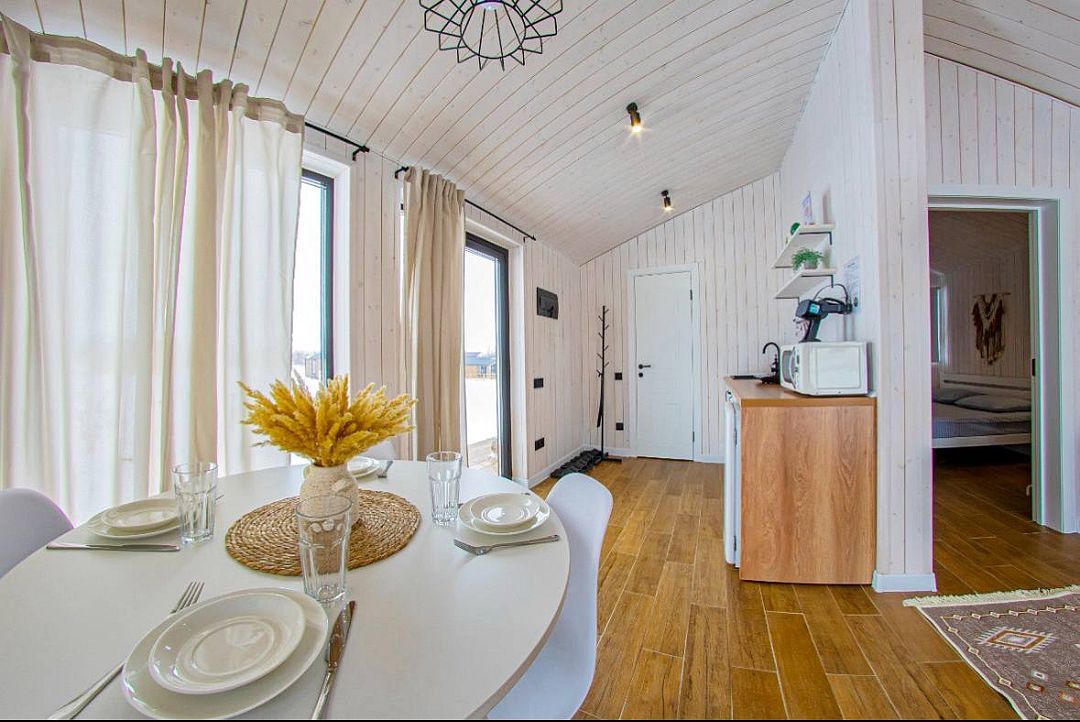 Светлый и уютный, оформленный в стильном дизайне, дом предлагает изолированную спальню, гостиную, обеденную зону, кухню и санузел с душем. Есть вся необходимая бытовая техника и посуда для комфортного проживания.