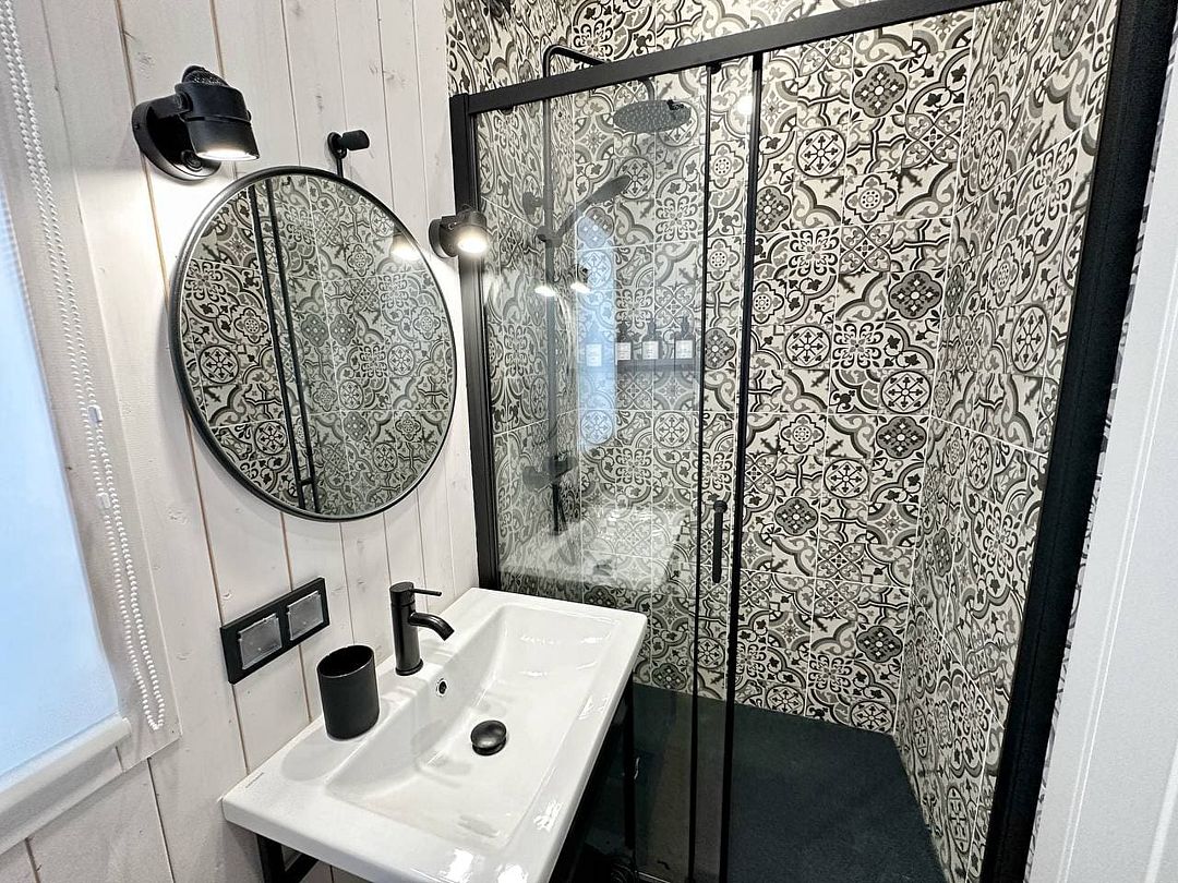 Домик располагает одной изолированной спальней с двуспальной кроватью и комфортным диваном в гостиной, что позволяет разместить до четырех человек. Санузел с душевой кабиной и феном, а также теплый пол создают максимальный комфорт.