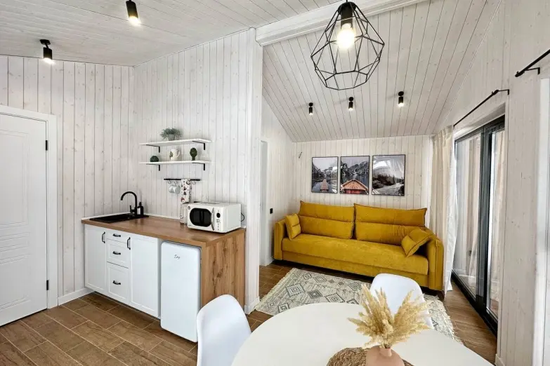 Интерьер коттеджа — это гармоничное сочетание современных технологий «умного дома» и домашнего уюта. Просторная гостиная, уютная спальня и функциональная кухня созданы для того, чтобы гости могли наслаждаться не только комфортом, но и близостью к природе. Телевизор со Smart TV, полный набор кухонных принадлежностей и продуманная эргономика сделают ваше пребывание в коттедже поистине беззаботным.