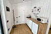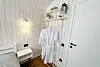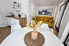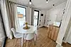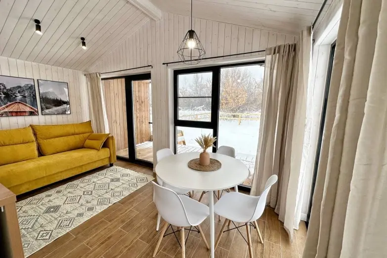 Для удобства готовки предоставляется набор посуды на четырех человек, который включает тарелки, кружки для чая, бокалы, ложки, вилки и ножи. В доме располагаются четыре спальных места: спальня с двуспальной кроватью и двуспальный диван в гостиной. Санузел оборудован душевой кабиной, феном и теплым полом. Обеденная зона вмещает до четырех человек.