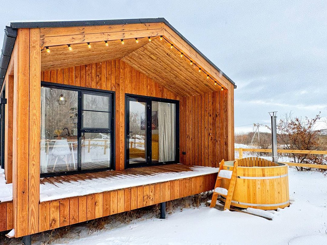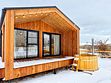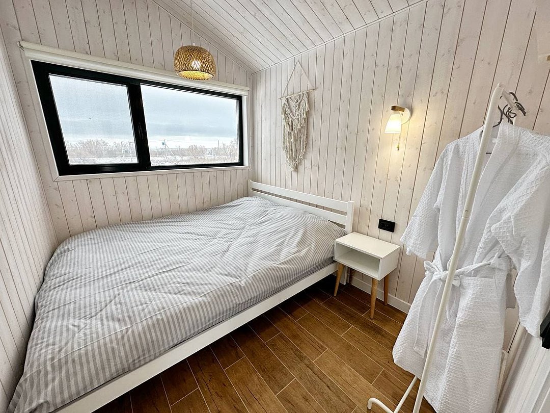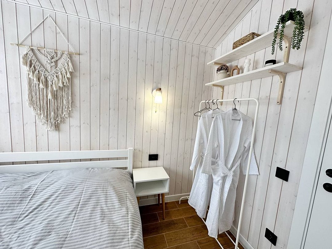 Домик располагает одной изолированной спальней с двуспальной кроватью и удобным диваном в гостиной, что позволяет разместить до четырех человек. Санузел с душевой кабиной и феном, а также теплый пол создают максимальный комфорт. Детская кроватка (по требованию)