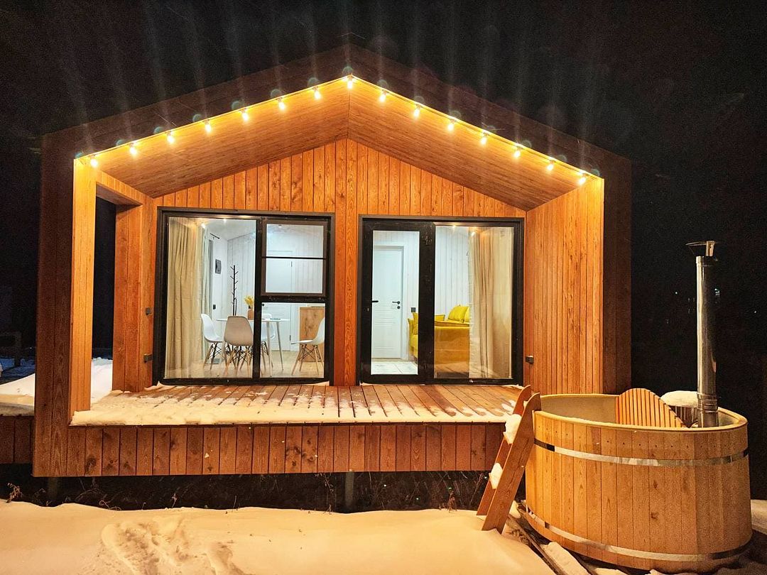 Территория вокруг дома не менее привлекательна: стильная подсветка создает романтическую атмосферу по вечерам. На уютной террасе можно наслаждаться свежим воздухом, а зона барбекю идеальна для приготовления блюд на огне. Особое удовольствие доставит отдых в бочке фурако с видом на величественные горы — это истинное погружение в мир спокойствия и гармонии.