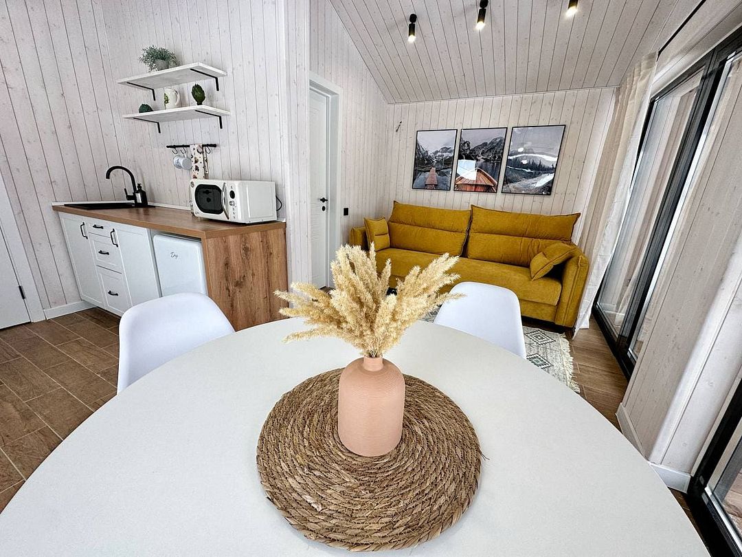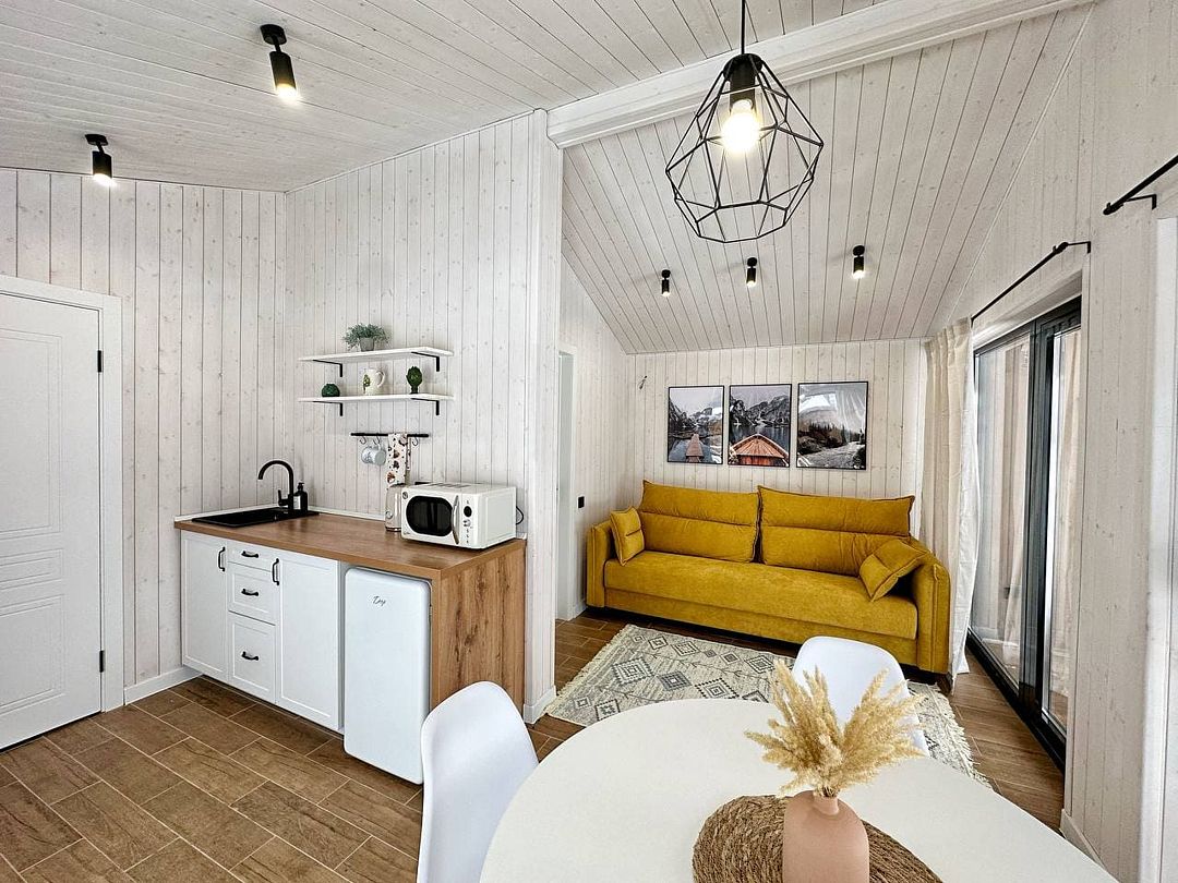 Одноэтажный светлый и уютный домик для отдыха с просторной гостиной.