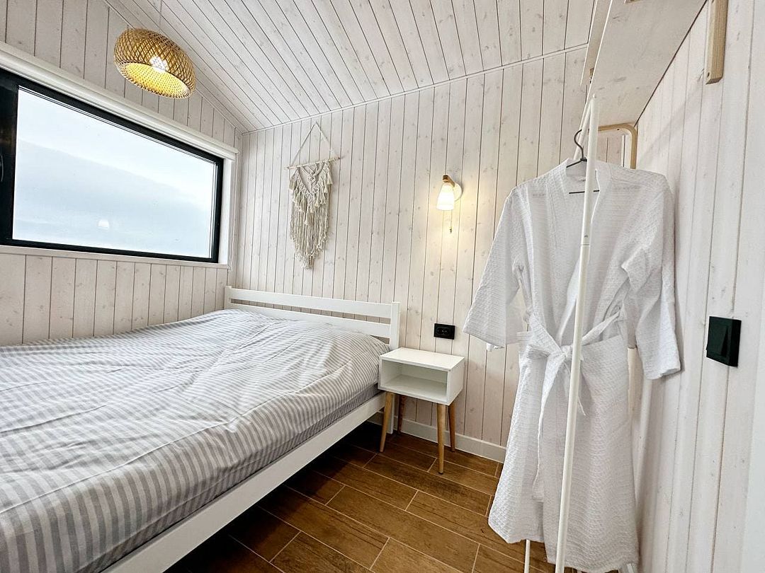 В доме одна изолированная спальня, гостиная, обеденная зона, кухня, так же санузел с душем. Имеется вся необходимая техника и посуда для вашего комфортного отдыха.