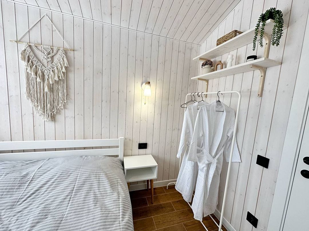 В доме одна изолированная спальня, гостиная, детская кроватка (по требованию), обеденная зона, кухня, также санузел с душем. Имеется вся необходимая техника и посуда для вашего комфортного отдыха.