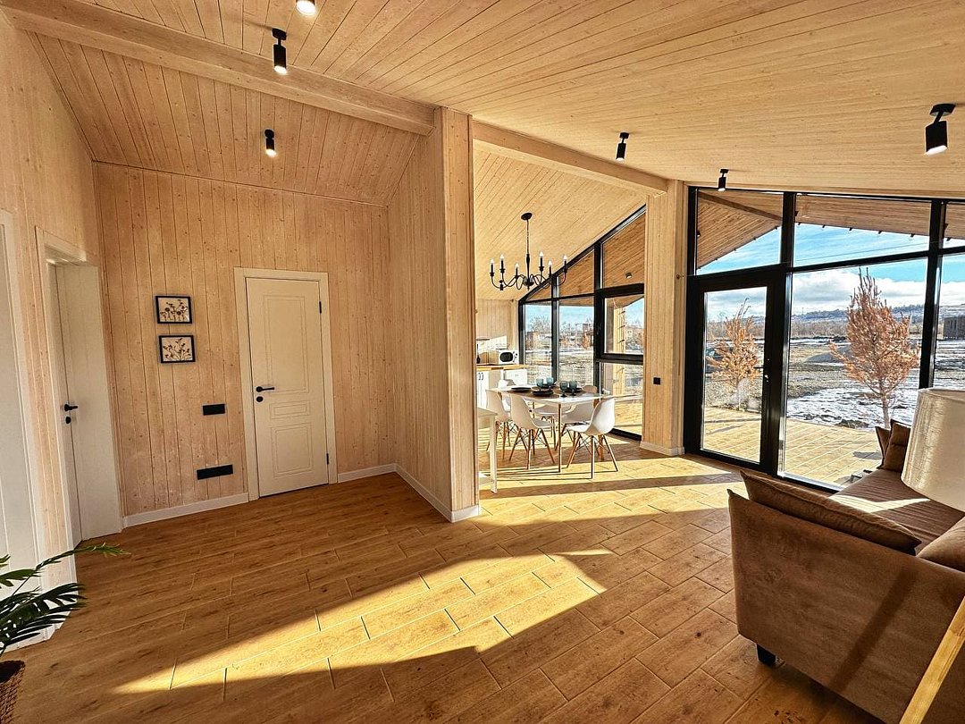 Из панорамных окон вы будете наблюдать невероятные виды на горы, как зимой, так и летом. Так же вы сможете полюбоваться потрясающим видом на Волгу, выбрав двухэтажный коттедж для размещения, или прогуляться пешком до реки, ведь здесь восхитительный воздух.