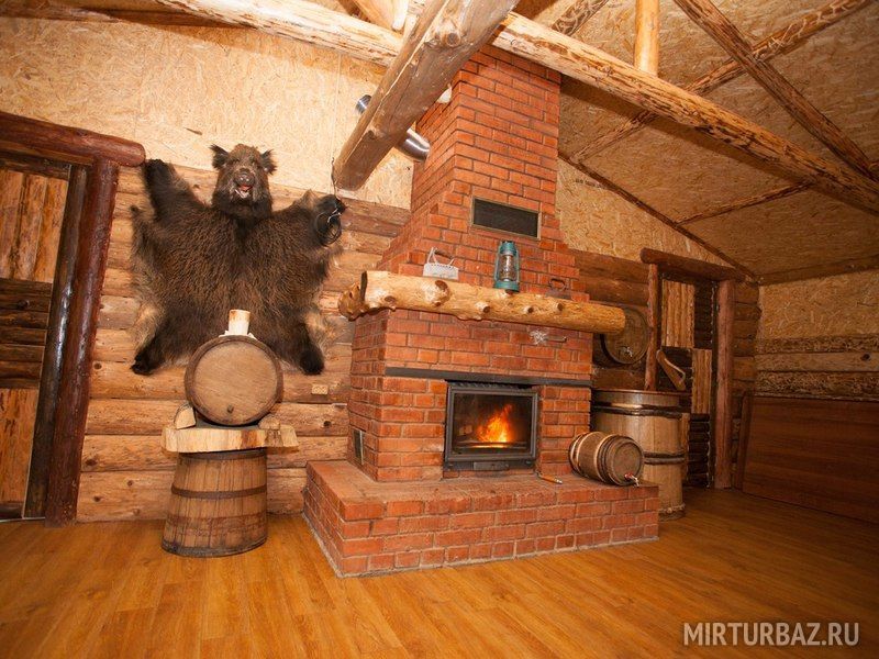 На первом этаже деревянного дома расположена классическая русская печь, которая привносит атмосферу древней Руси и обеспечивает теплом помещения. А на комфортной деревянной кровати приятно будет посмотреть любимые передачи по ТВ. Второй этаж представляет собой 3 комнаты — 2 закрытого типа и 1 — открытого. В каждой из них расположились двуспальные кровати из массивной древесины.