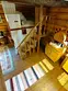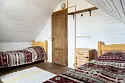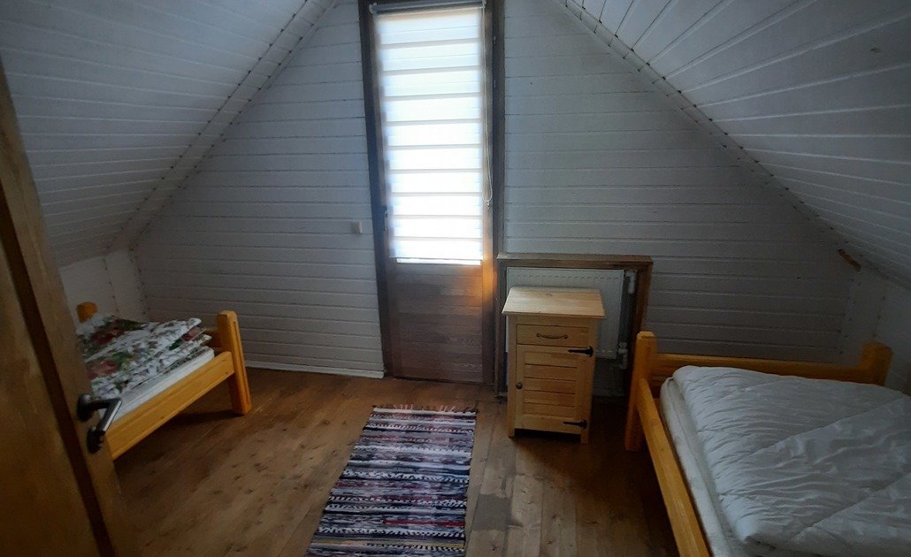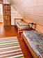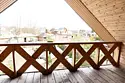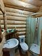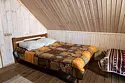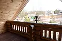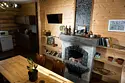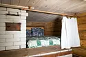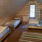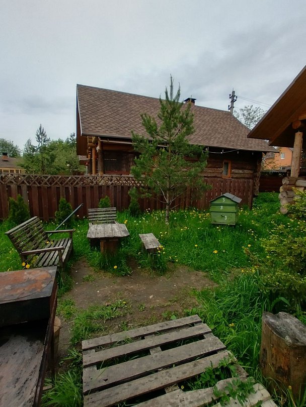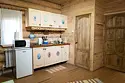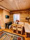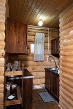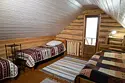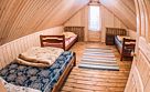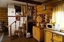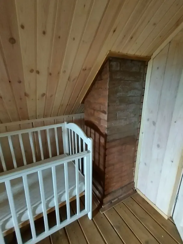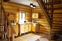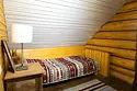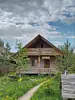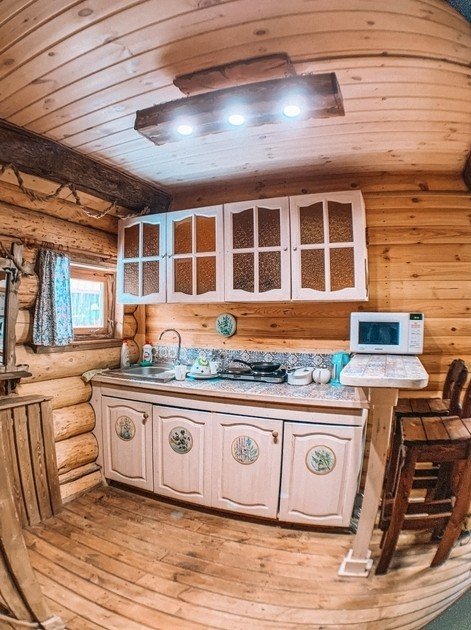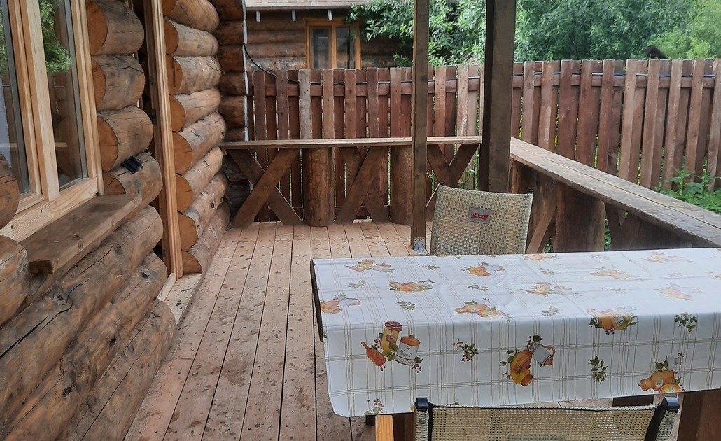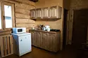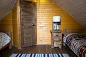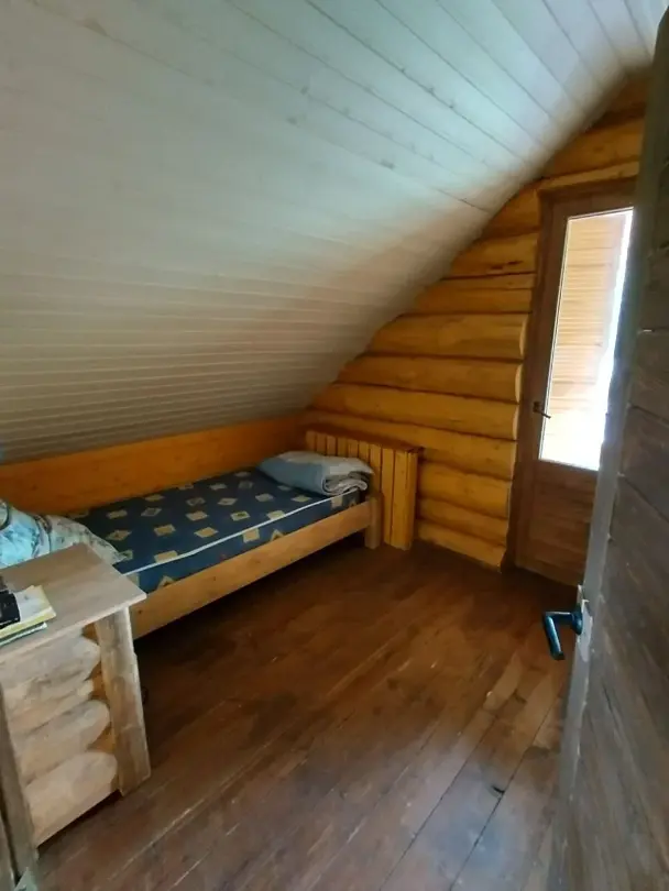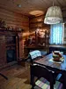 Двухэтажный домик из сруба с балконом и террасой. В доме действующая русская печь с двумя спальными местами. Дом подходит для проживания 6 гостей. На территории всего 7 гостевых домиков, детская площадка, небольшой пруд с рыбалкой, русская баня, банный чан.
