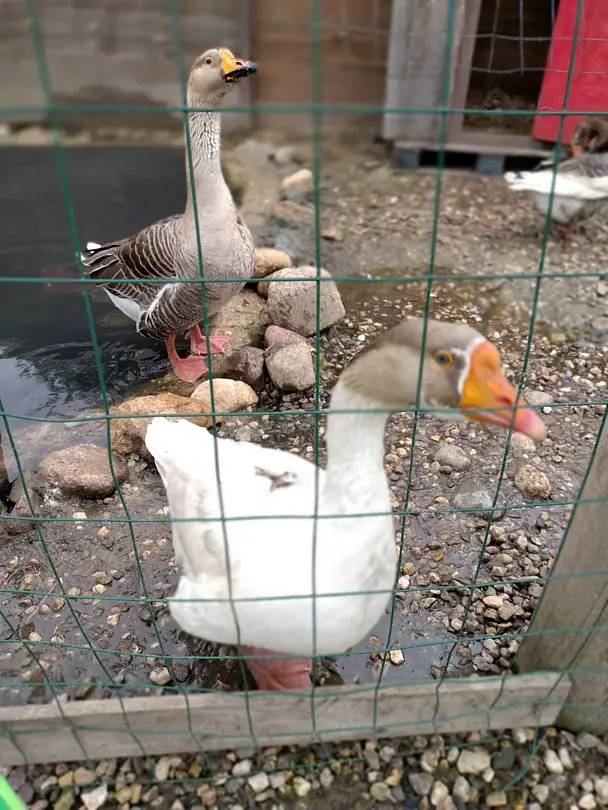 - С представителями деревенской жизни — гусями, утками и петухами. Петух вас обязательно разбудит утром).