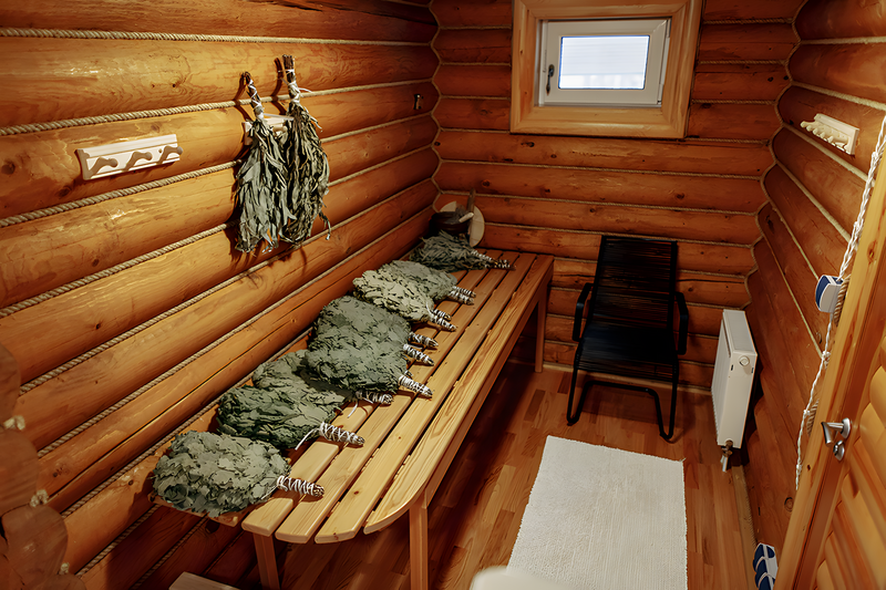 Инфраструктура: зона отдыха, полотенца, шапочки, березовые веникиК Вашим услугам великолепная сауна, рассчитанная на комфортный отдых до шести человек. Просторная парная, комната для отдыха, банные принадлежности, такие как веники и масла, массажный стол, купель с ледяной водой — все необходимое для поистине расслабляющей и оздоравливающей банной процедуры.