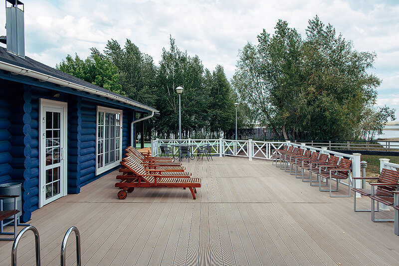 А после парной, Вы можете отдохнуть на большой террасе с удобными лежаками, наслаждаясь чудесным видом и наполняясь солнечной энергией в жаркий летний день. В стоимость аренды бани включены 4 банных полотенца и шапочки, а также веник.