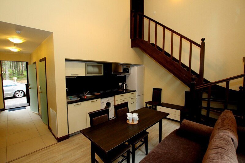 Комфортабельный двухэтажный коттедж с сауной на шесть человек. Шесть человек плюс два дополнительных места на двухместном диване в гостиной.