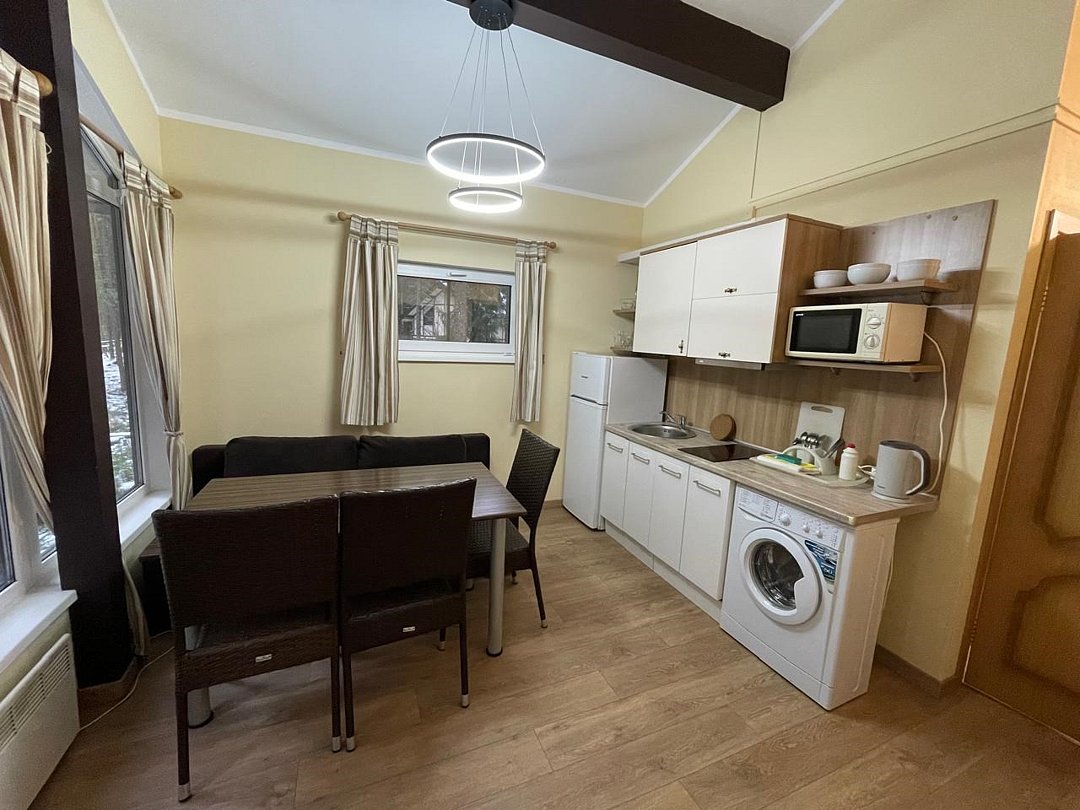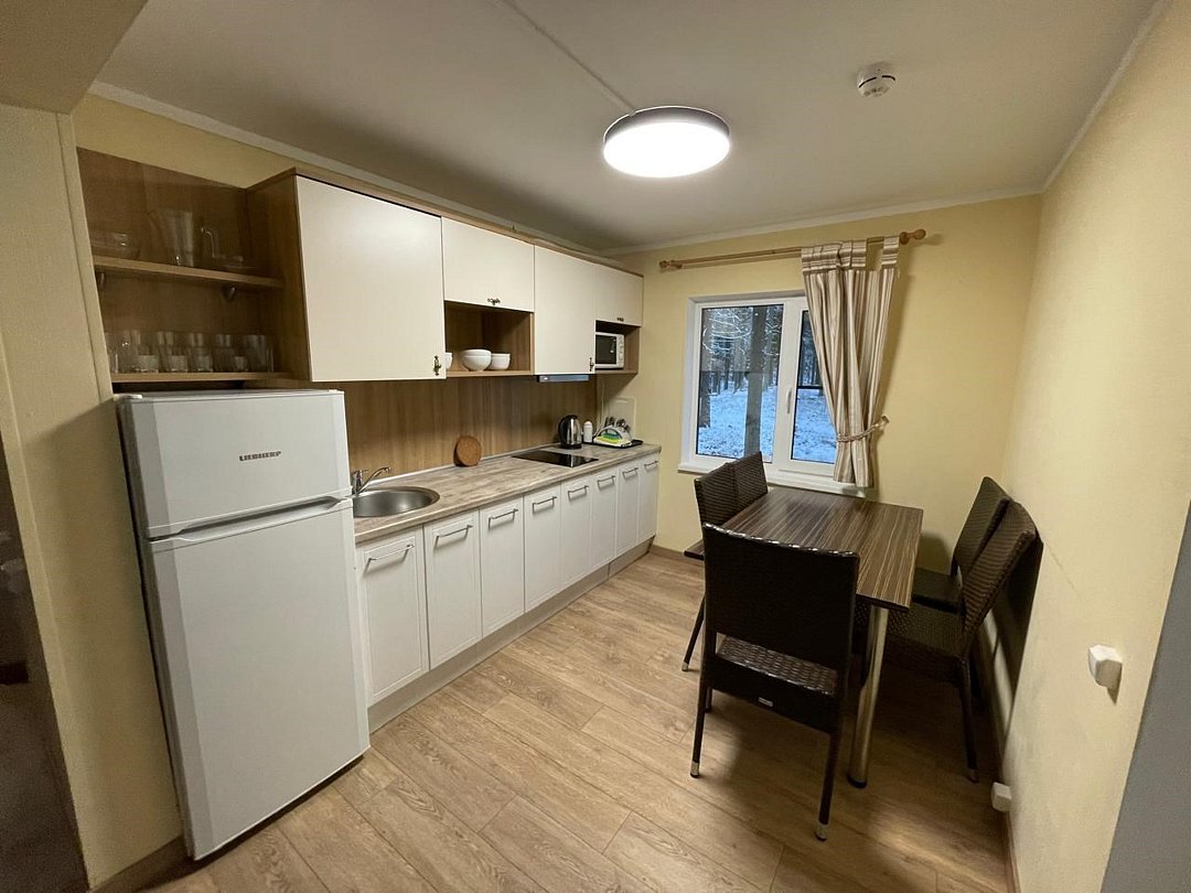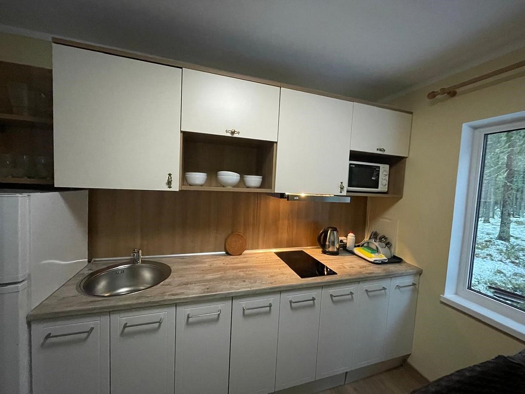 Кухня оснащена двухконфорочной плитой, СВЧ-печью, чайником, холодильником и посудомоечной машиной, а также столом и стульями. В наличии посуда для приготовления: средняя сковорода, маленькая сковорода, дуршлаг, терка, разделочная доска, разделочные ножи, открывашка, средний ковш, маленький ковш и средняя кастрюля. Посуда и приборы для сервировки на восемь персон и шампуры. Решетки для мангала отсутствуют.