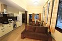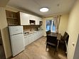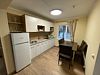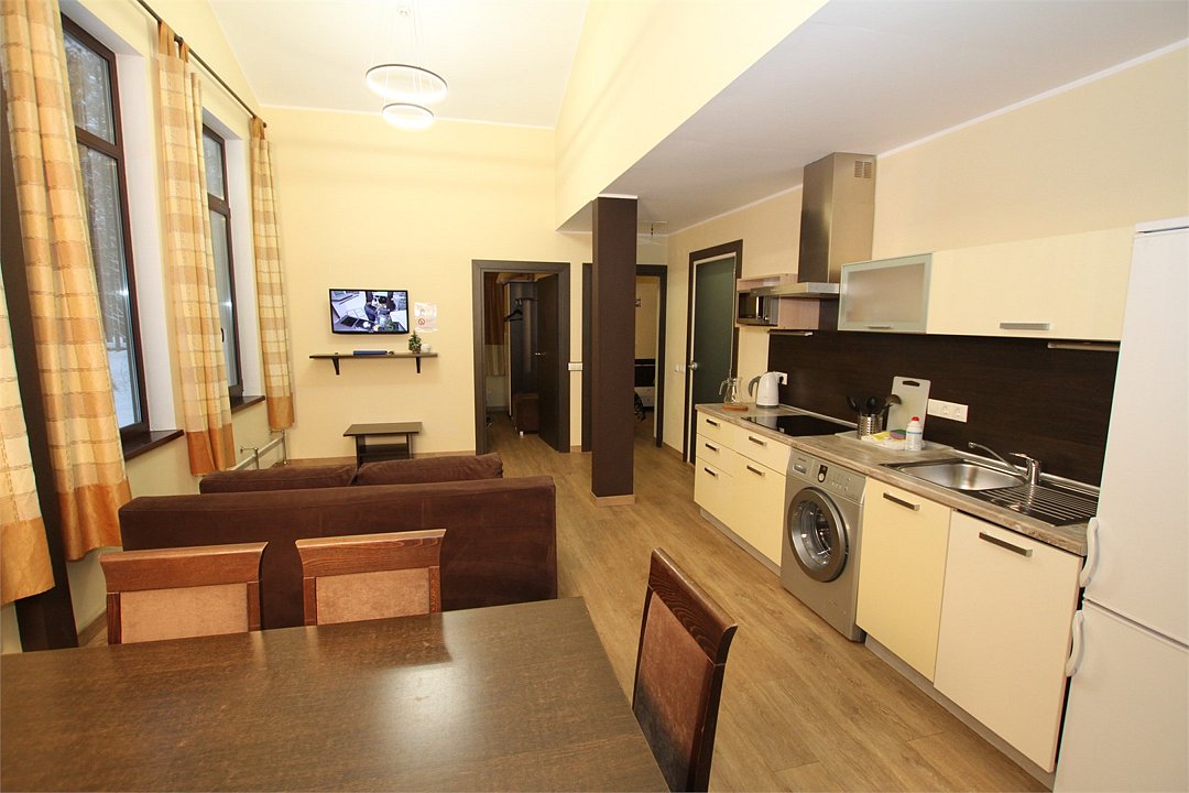 Кухня: четырехконфорочная плита, микроволновая печь, чайник, большой холодильник, стиральная машина, посудомоечная машина, посуда для приготовления, посуда, приборы для сервировки на восемь человек. Гостиная: панорамное окно, диван (трансформируется в дополнительное спальное место для двоих), стол, стулья.