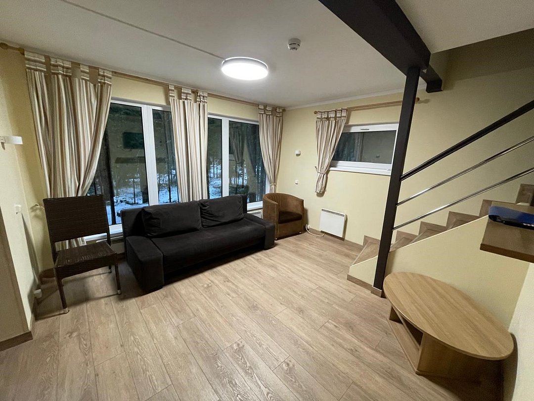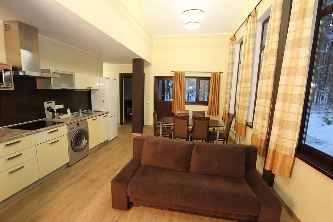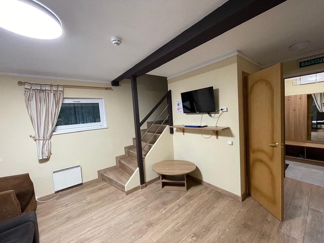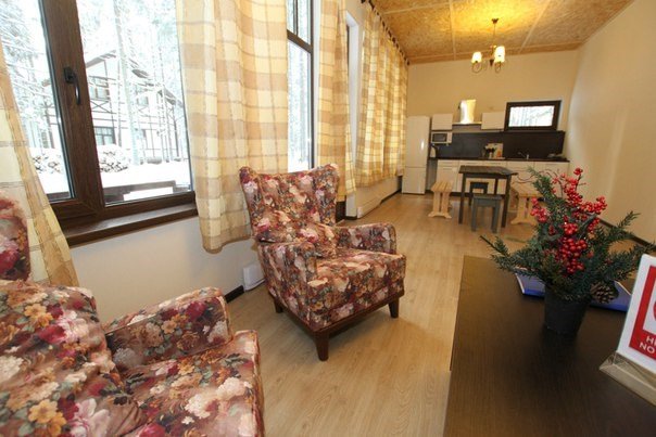 Гостиная оборудована панорамным окном, диваном (который трансформируется в дополнительное спальное место для двоих), столом и двумя креслами. Предоставляется цифровое телевидение (LED телевизор). В коттедже имеются два санузла с душем и стиральная машина. Просторная сауна вмещает десять человек.