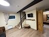 Гостиная оснащена панорамным окном, диваном (превращающимся в дополнительное спальное место для двоих), журнальным столом и креслом. Санузлы на первом этаже включают отдельно туалет с раковиной и полотенцесушитель, а также отдельную душевую, раковину, стиральную машину и теплый пол. Сауна вмещает троих человек. На втором этаже расположен еще один санузел с унитазом, раковиной и полотенцесушителем. В коттедже имеется аналоговое телевидение (LED телевизор), внутренний телефон и Wi-Fi, которые включены в стоимость.