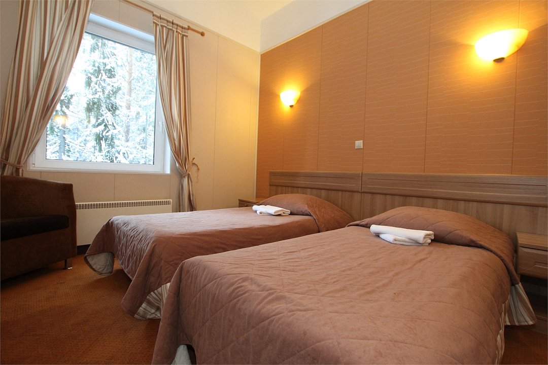 Номера стандартные двухместные. Размещение возможно одноместное или двухместное. Две кровати (90х200) соединяются между собой, шкаф, тумбочки прикроватные, электрический чайник, мини-холодильник, стол, стулья, кресло, аналоговое телевидение (LED-телевизор LG). Постельное белье, полотенца, тапочки.