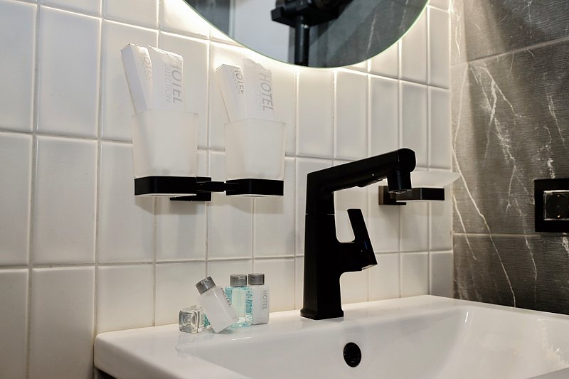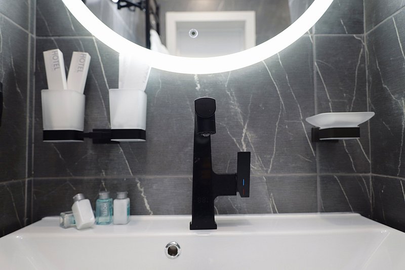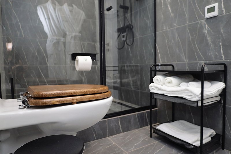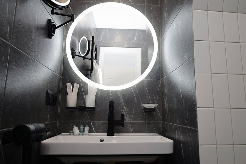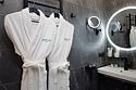 - ванная комната с душевой кабиной, фирменный банный текстиль, тапочки, фен, косметический набор;
