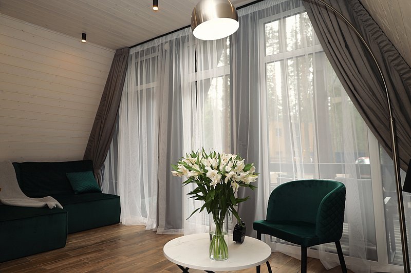 Коттедж «Полулюкс с одной спальней» расположен в сосновом лесу, на который открывается живописный вид из окон. Этот номер с лаконичным дизайнерским интерьером идеально подойдет и для отдыха на выходных, и для длительного проживания. Рассчитан на 2-6 гостей, при необходимости можно арендовать детскую кроватку.