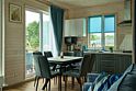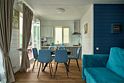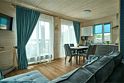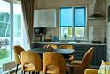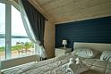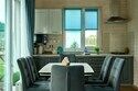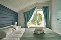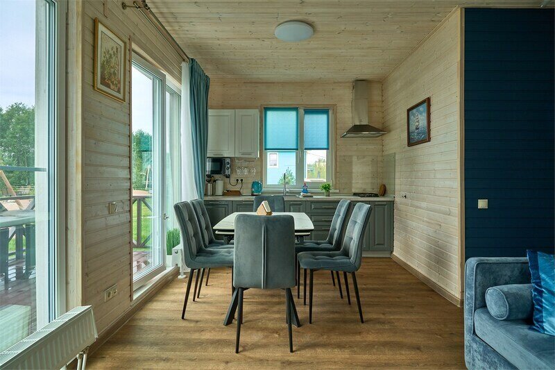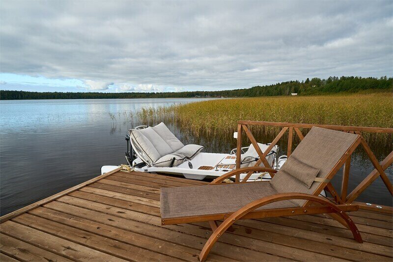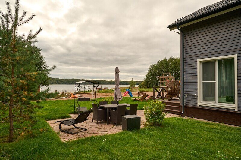 Двухэтажный коттедж с двумя спальнями и полноценной кухней на первом этаже, с видом на озеро и с большой террасой с выходом из кухни.