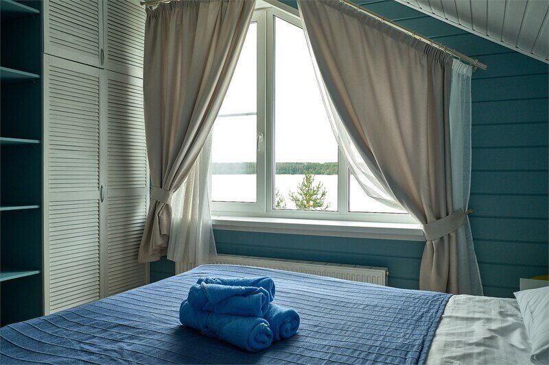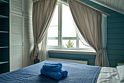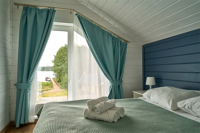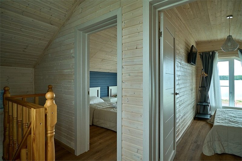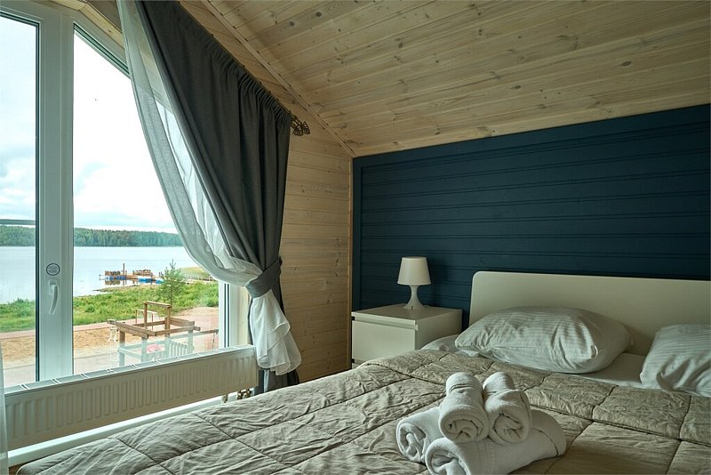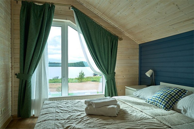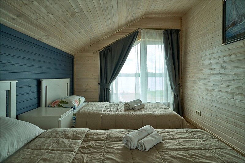 Двухэтажный коттедж с тремя отдельными спальнями и большой гостиной с полноценной кухней (вся техника и посуда) с видом на озеро. Два санузла.