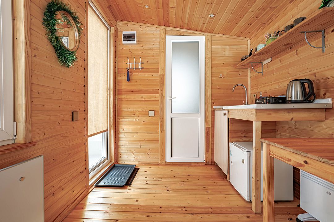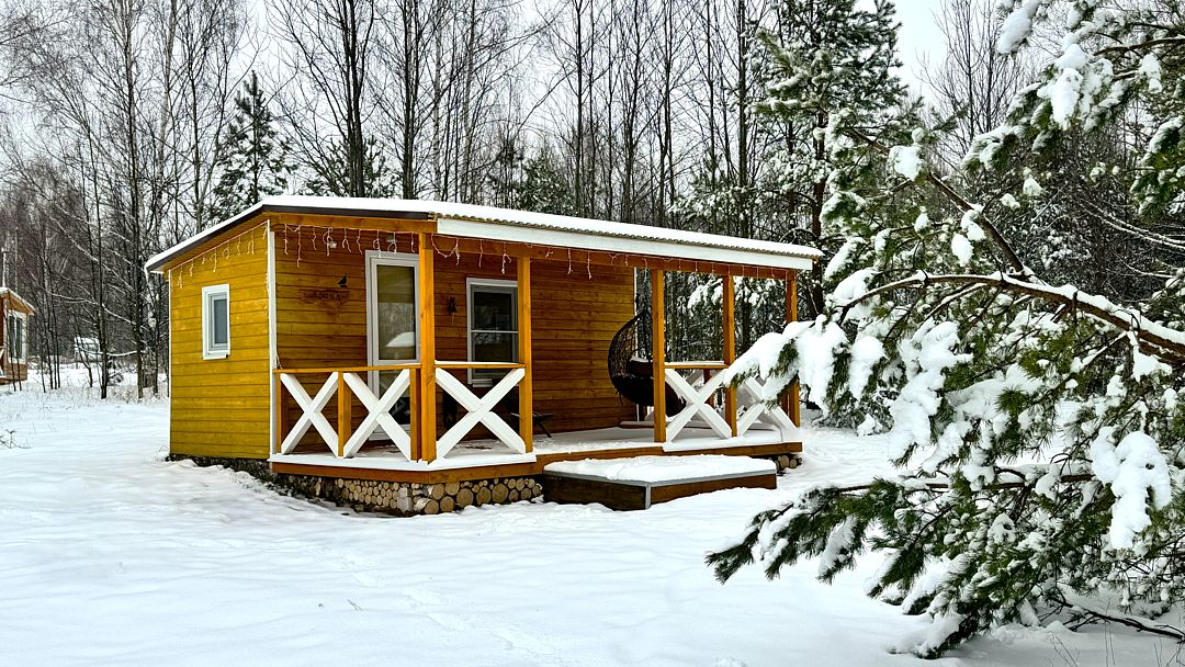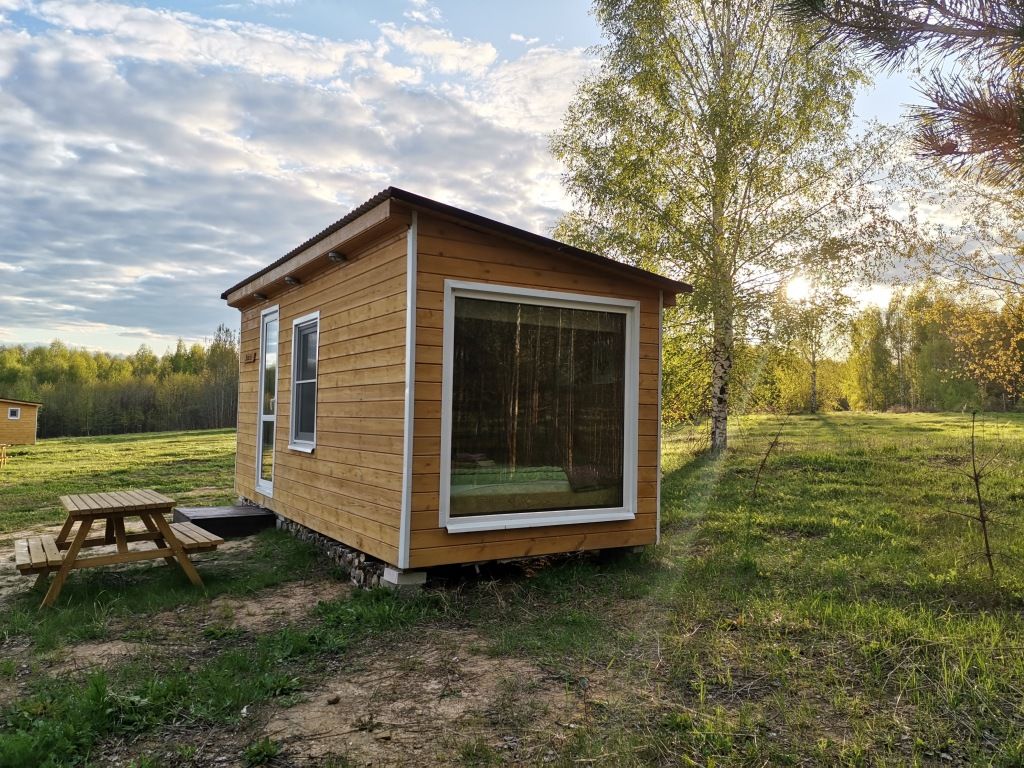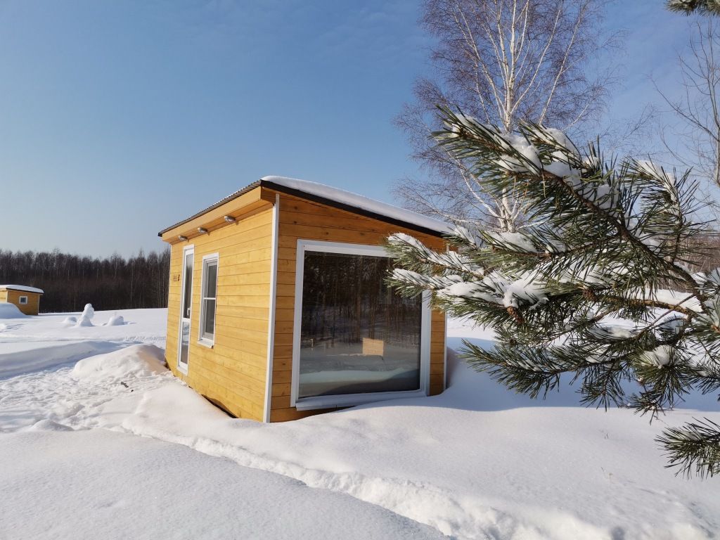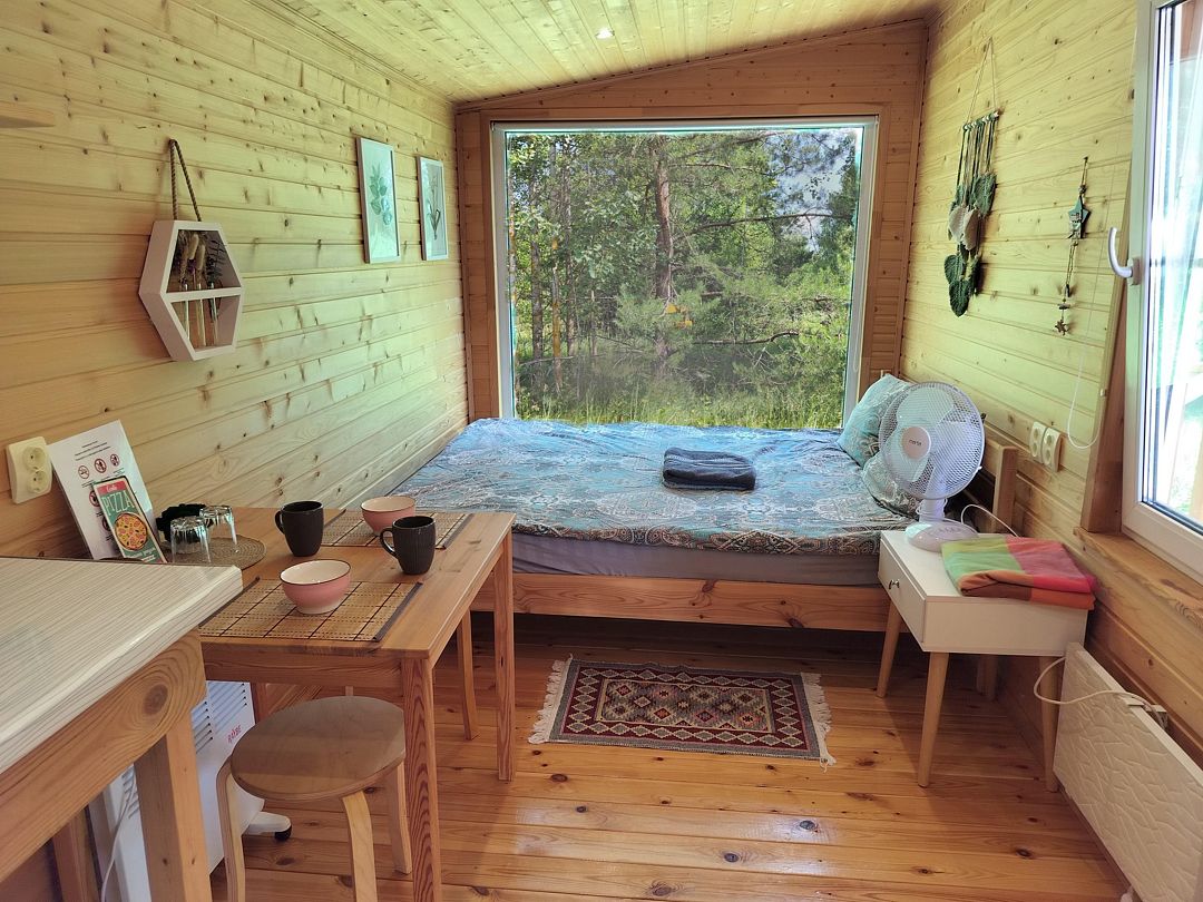 В домике 2 кровати около большого окна с видом на природу, санузел с душем и теплым полом, обогреватель.