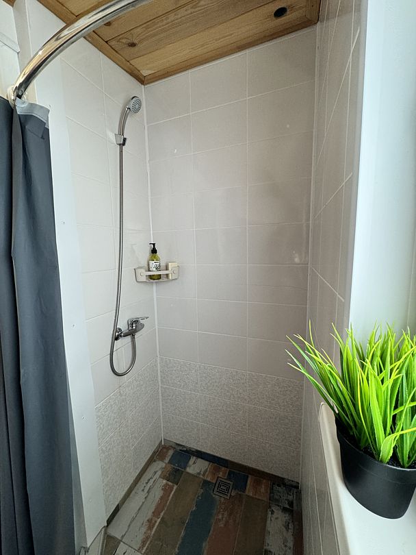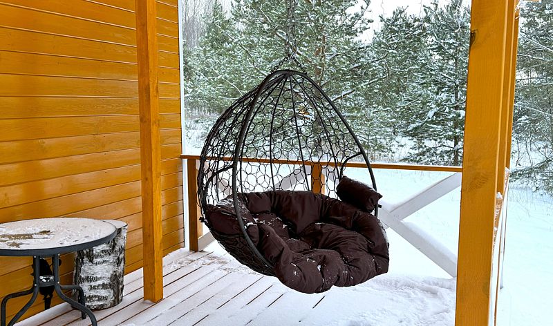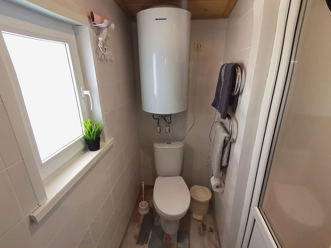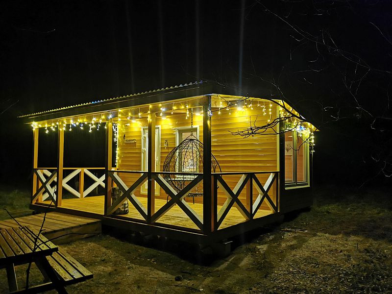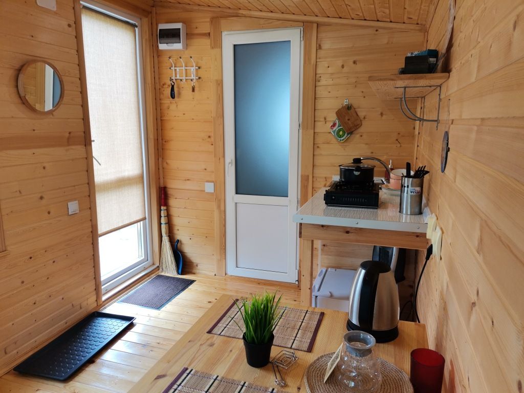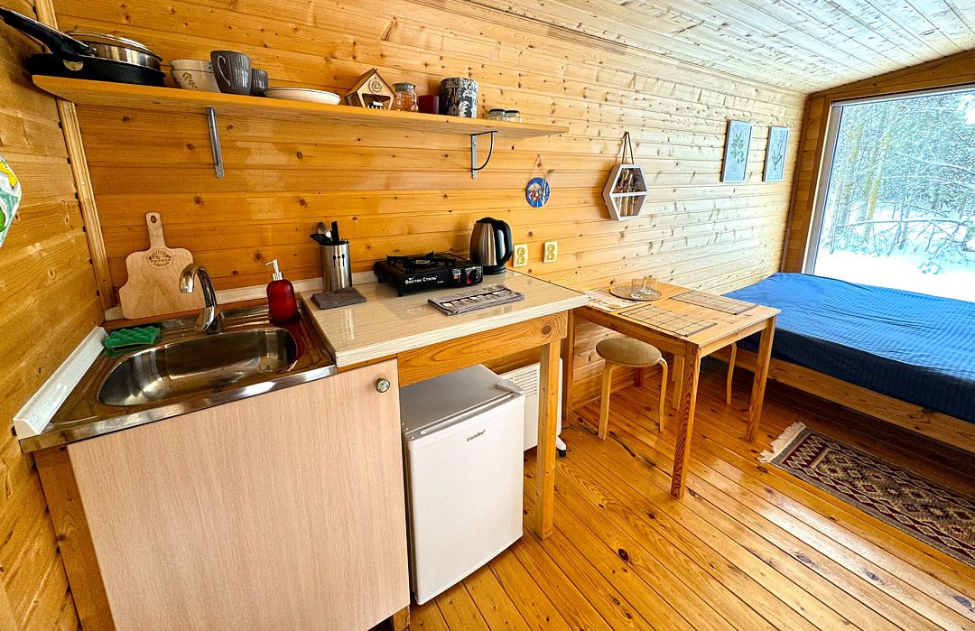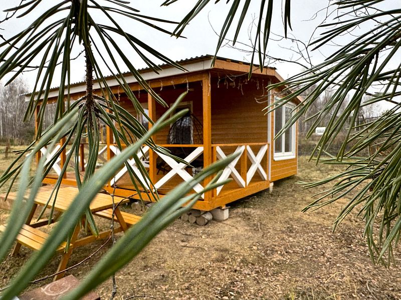 В домике 2 кровати около большого окна с видом на природу, санузел с душем и теплым полом, обогреватель.