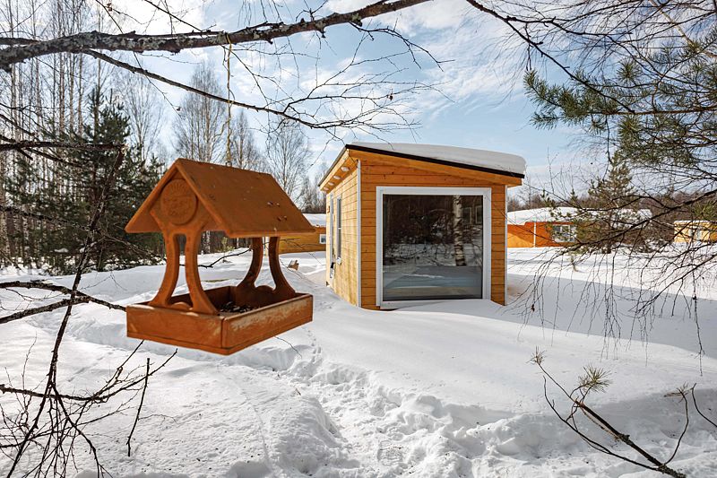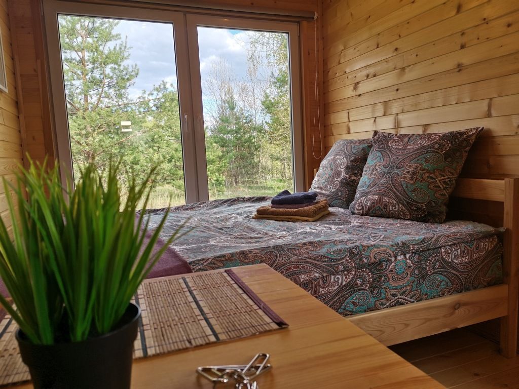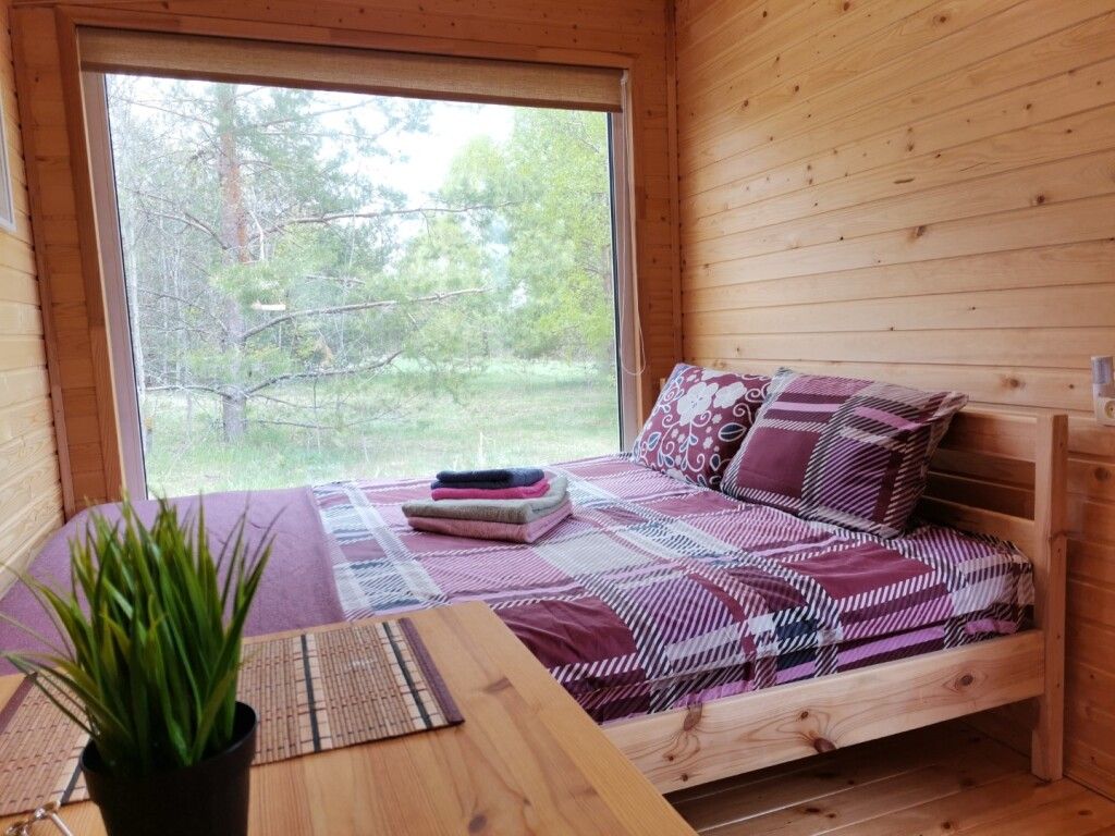 В каждом домике двуспальная кровать около большого окна с видом на природу, санузел с душем и теплым полом, обогреватель.