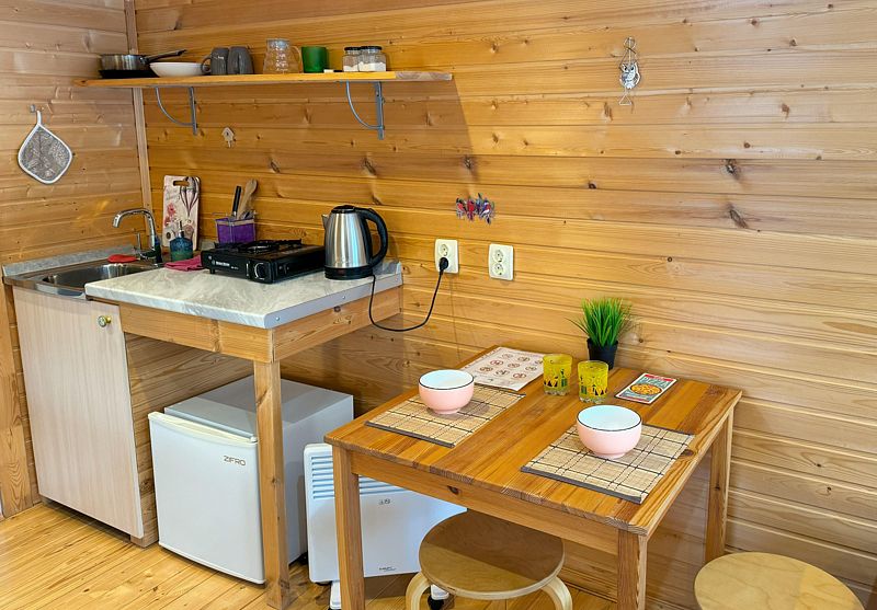 Кухонная зона: электрочайник(выдаём) , газовая плитка(выдаём), набор посуды для двух человек.