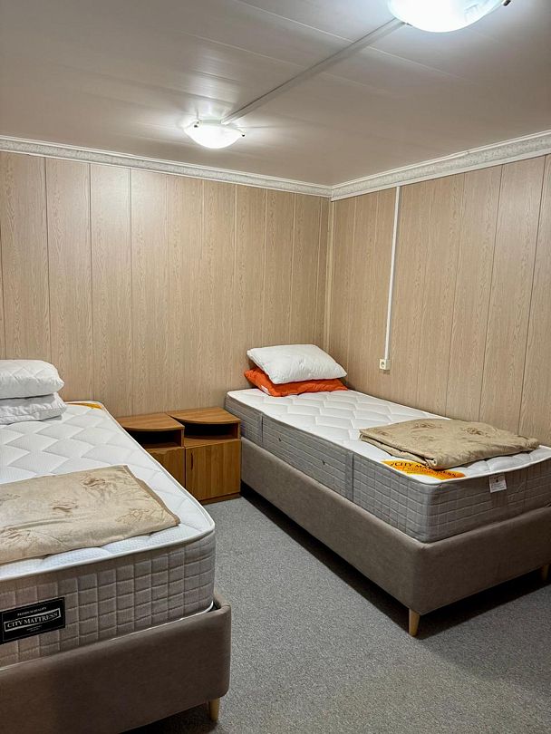 В одном здании находится девять комнат, в каждой из которых установлены две кровати. Оснащение номера: холодильник, две односпальные кровати, стол и стулья, а также шкаф.