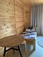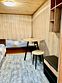 Интерьер оформлен в светлых древесных тонах, в комнате — обеденная зона с деревянным столом и табуретами, а также базовая мебель для удобства.