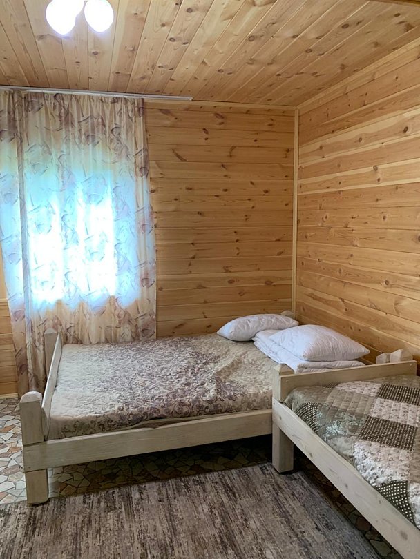Уютный 4х местный номер на 2-м этаже двухэтажного коттеджа. В номере имеется: двухспальная кровать, 2 односпальные кровати, чайник. Так же имеется крытая терраса-балкон (смежная на 2 номера)