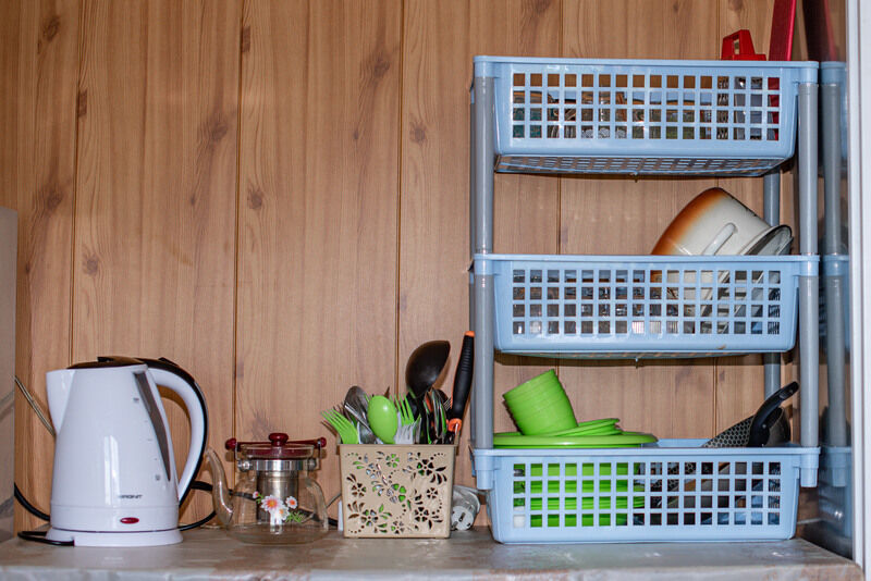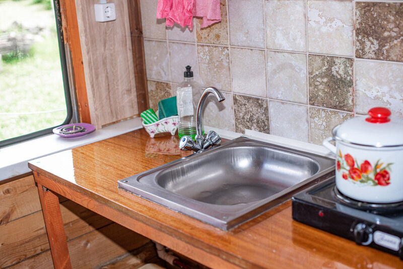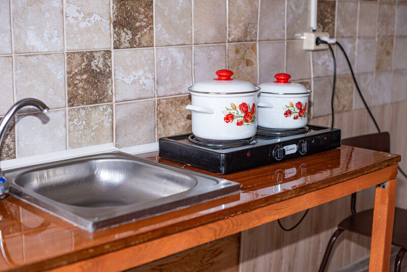 В номере предусмотрены базовые удобства: раковина, холодильник, микроволновка, шкафчик, а также стол и стулья для приёма пищи.