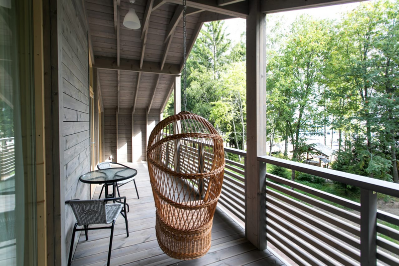 Каждый номер имеет отдельный вход и крытую террасу перед ним. На ней можно с комфортном разместиться в шезлонгах и выпить утренний кофе, наблюдая гладь Ладожского озера.