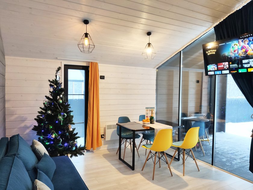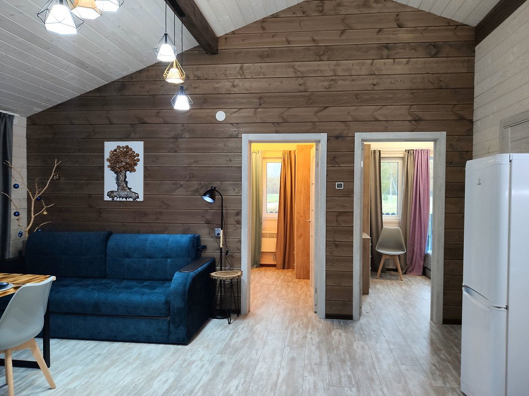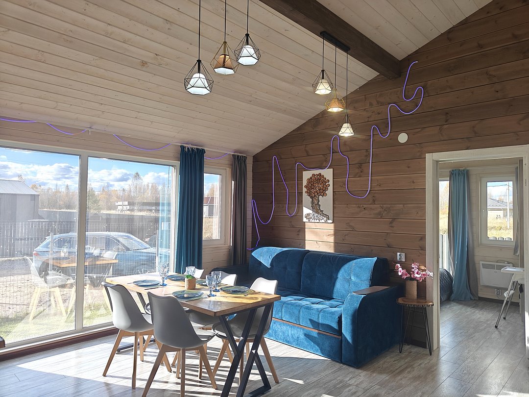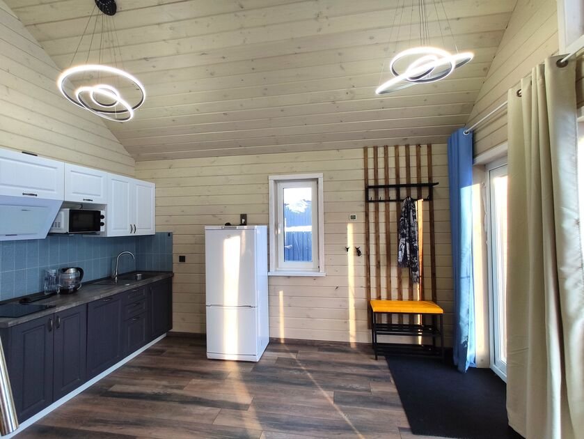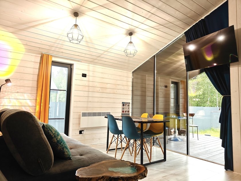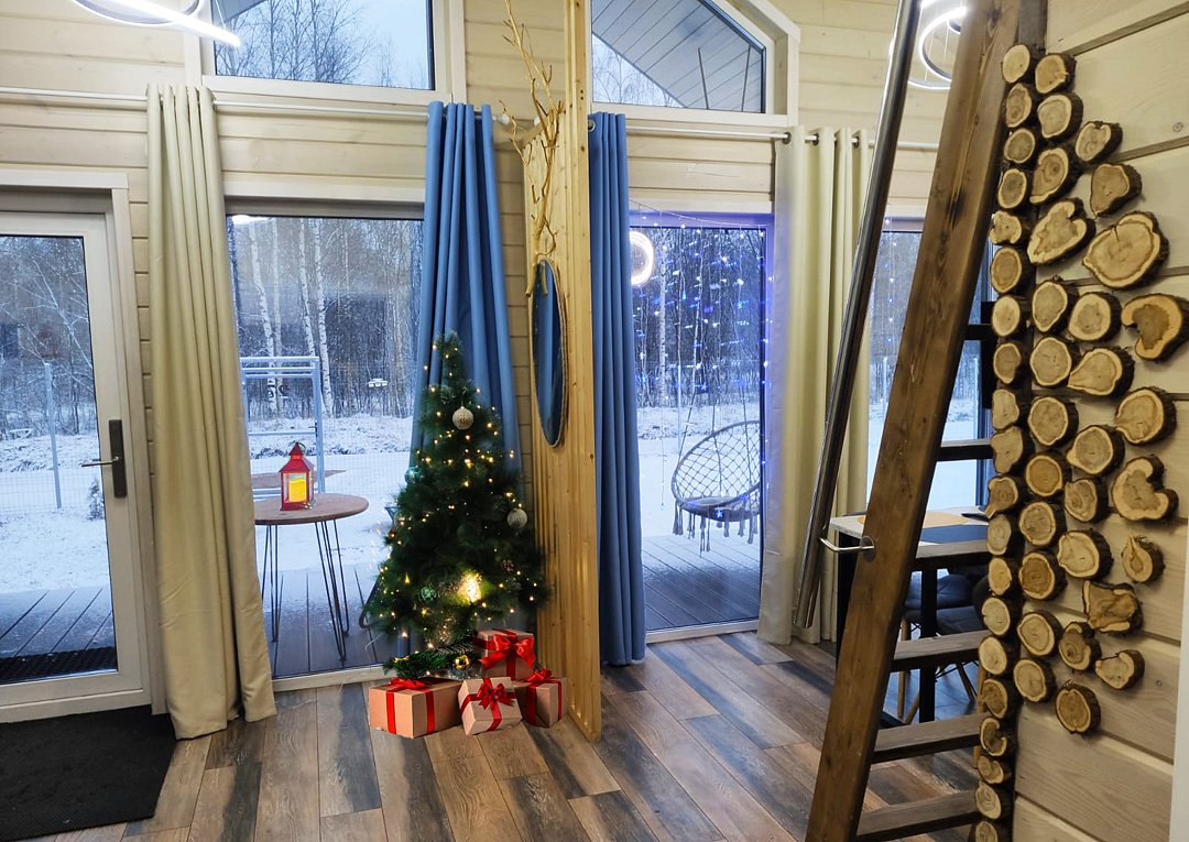 Все коттеджи полностью оборудованы для полноценного отдыха и включают панорамную сауну с лечебным можжевельником, кухню, оснащенную бытовой техникой и набором посуды, удобные кровати с ортопедическими матрасами, просторную гостиную, современный санузел и большую террасу с качелями. У каждого дома имеется собственная мангальная зона для приготовления блюд на свежем воздухе.