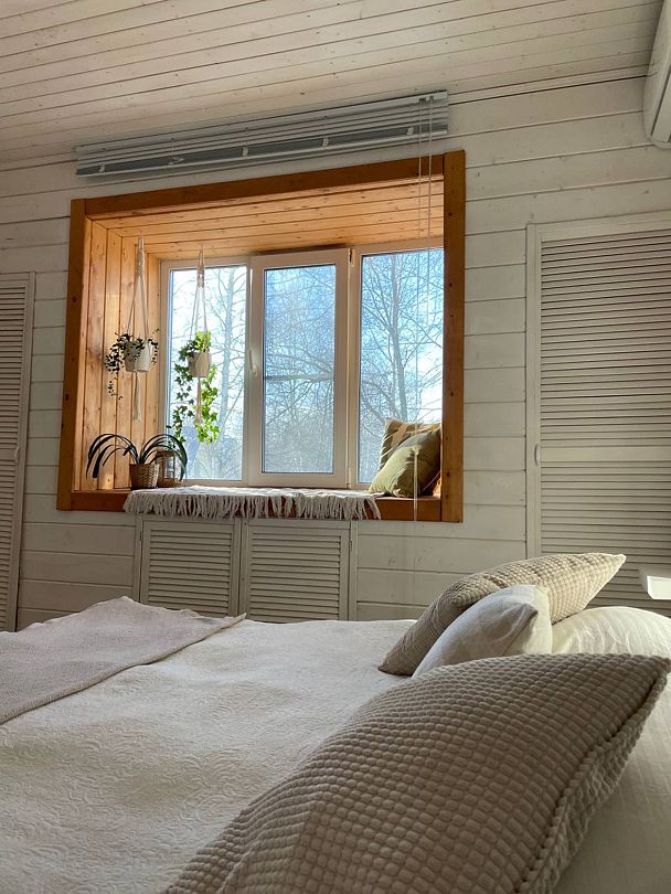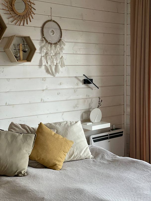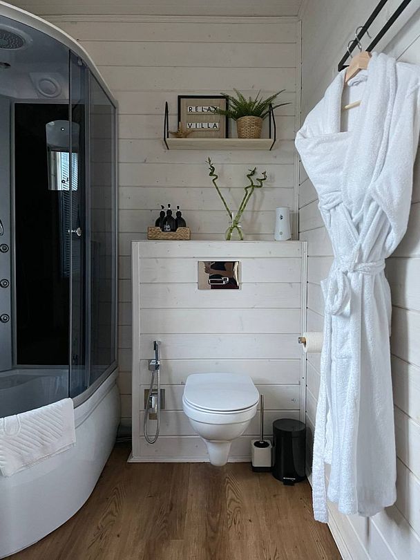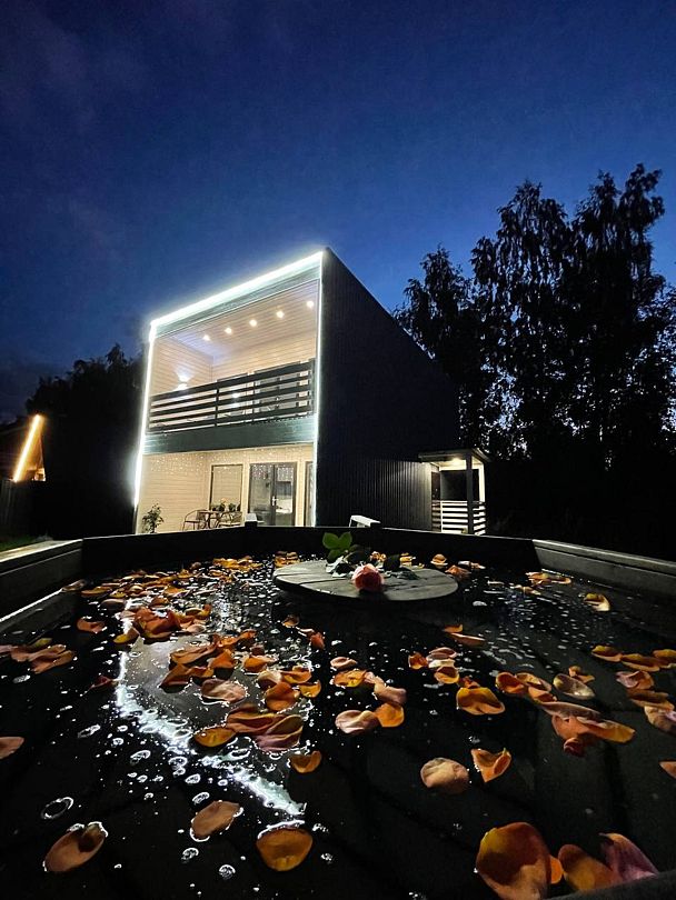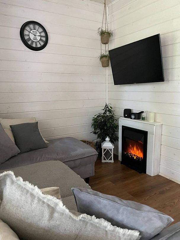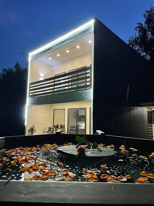 В доме предусмотрены две уютные спальни с роскошными кроватями, уютная гостиная с мерцающим электрическим камином. Современная кухня полностью оборудована всем необходимым, есть кулер с чистой питьевой водой. В гостиной — раскладной двуспальный диван и телевизор с функцией Smart TV, умная колонка с Алисой, настольные игры и Wi-Fi для развлечения. Также в доме две ванные комнаты: на первом этаже с просторной двуместной ванной и на втором этаже с гидромассажной душевой кабиной и музыкальным сопровождением.