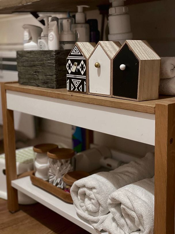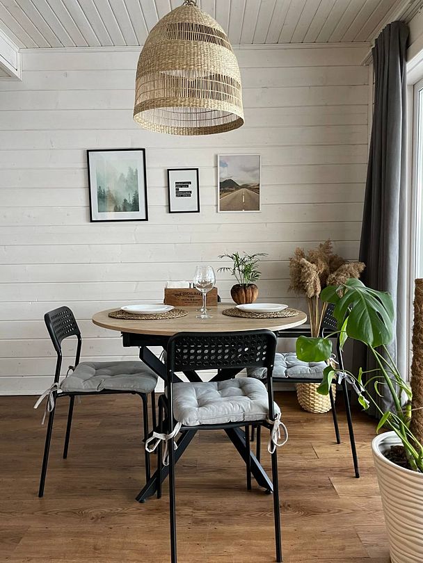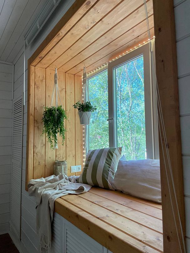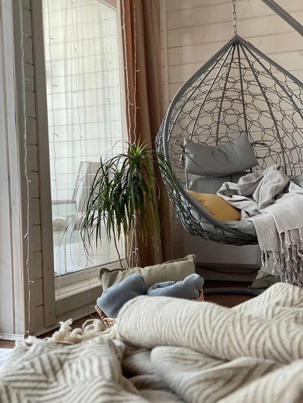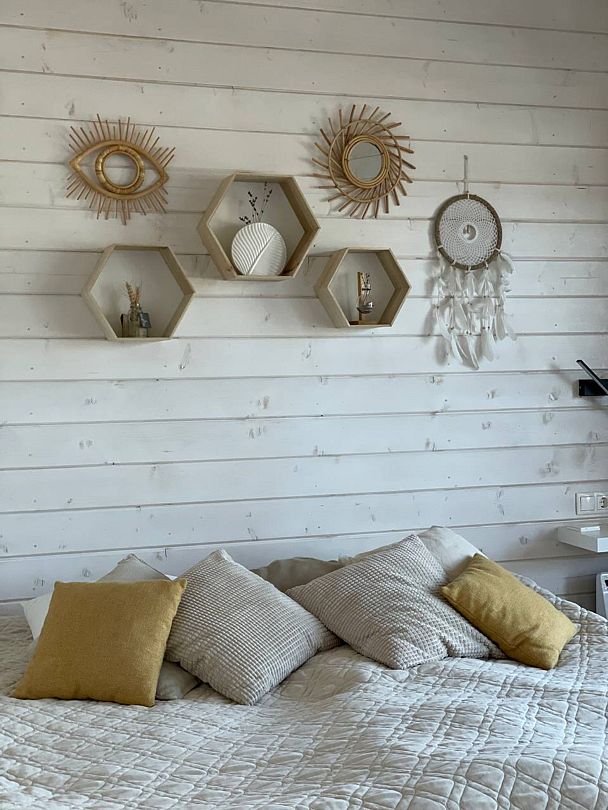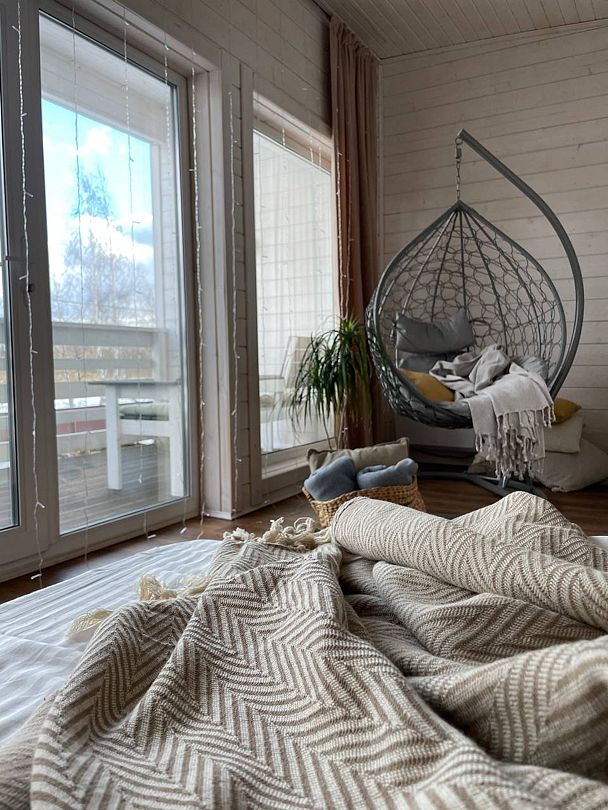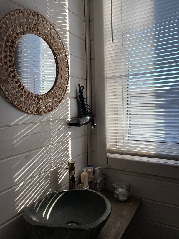 В доме предусмотрены две уютные спальни с роскошными кроватями, уютная гостиная с мерцающим электрическим камином. Современная кухня полностью оборудована всем необходимым, есть кулер с чистой питьевой водой. В гостиной — раскладной двуспальный диван и телевизор с функцией Smart TV, умная колонка с Алисой, настольные игры и Wi-Fi для развлечения. Также в доме две ванные комнаты: на первом этаже с просторной двуместной ванной и на втором этаже с гидромассажной душевой кабиной и музыкальным сопровождением.