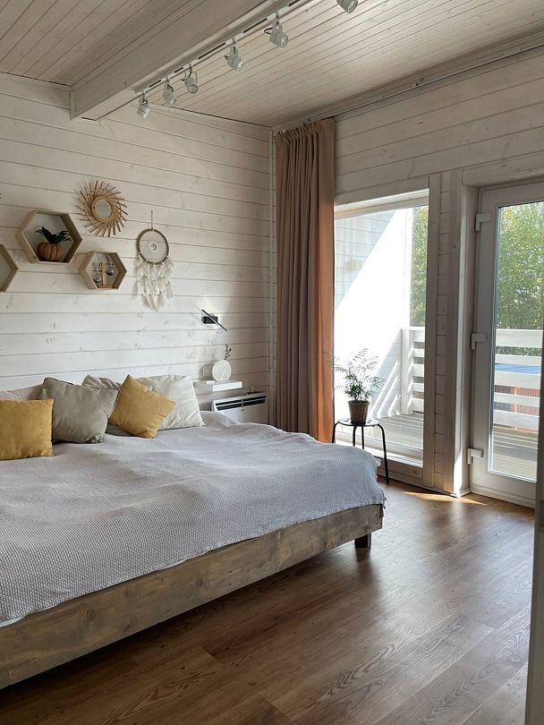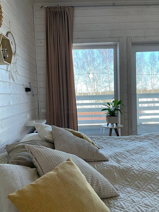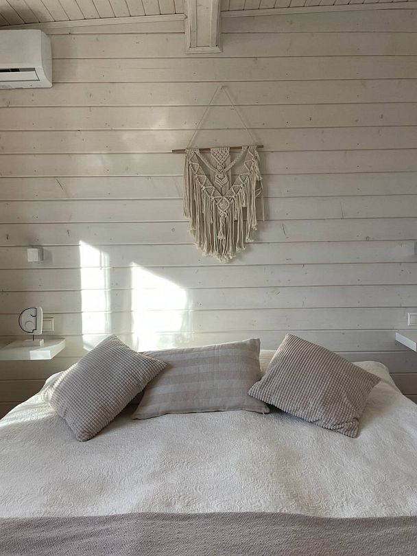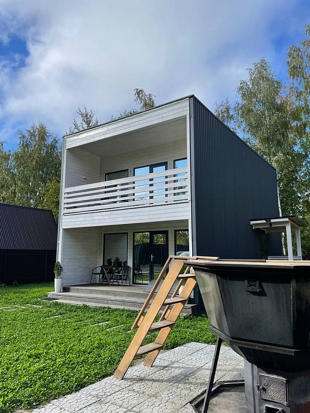В доме две изолированных спальни с кроватями King size 1,8м и Double king size 2x2м. Гостиная с электрическим камином, полностью оснащённая кухня, кулер с питьевой водой, раскладной двуспальный диван, телевизор (Smart TV), колонка с Алисой, настольные игры, Wi-Fi. Санузел на первом этаже с двухместной ванной и санузел на втором этаже с душевой кабиной с гидромассажем и музыкой.