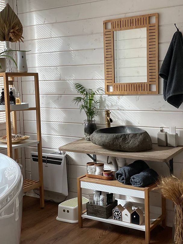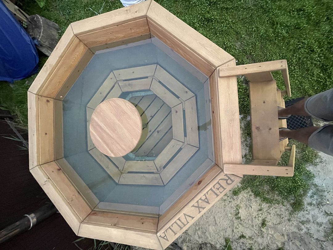Банный чан топится дровами до температуры 38–45 градусов, что делает купание комфортным в любое время года.